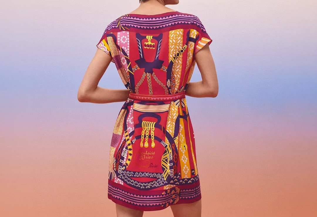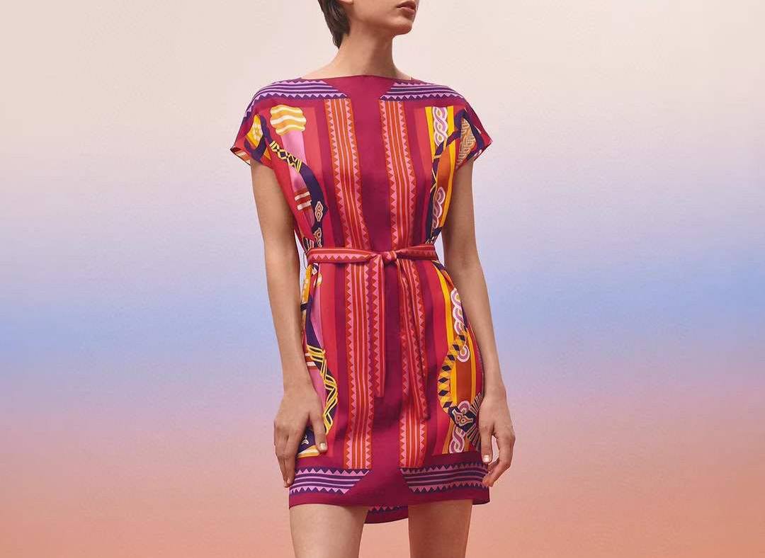 Шелковое платье Hermes LUX-91687 — элегантное платье с короткими рукавами и поясом. Оно выполнено в ярких оттенках красного, желтого и фиолетового цветов. Платье идеально подходит для создания стильного и запоминающегося образа.