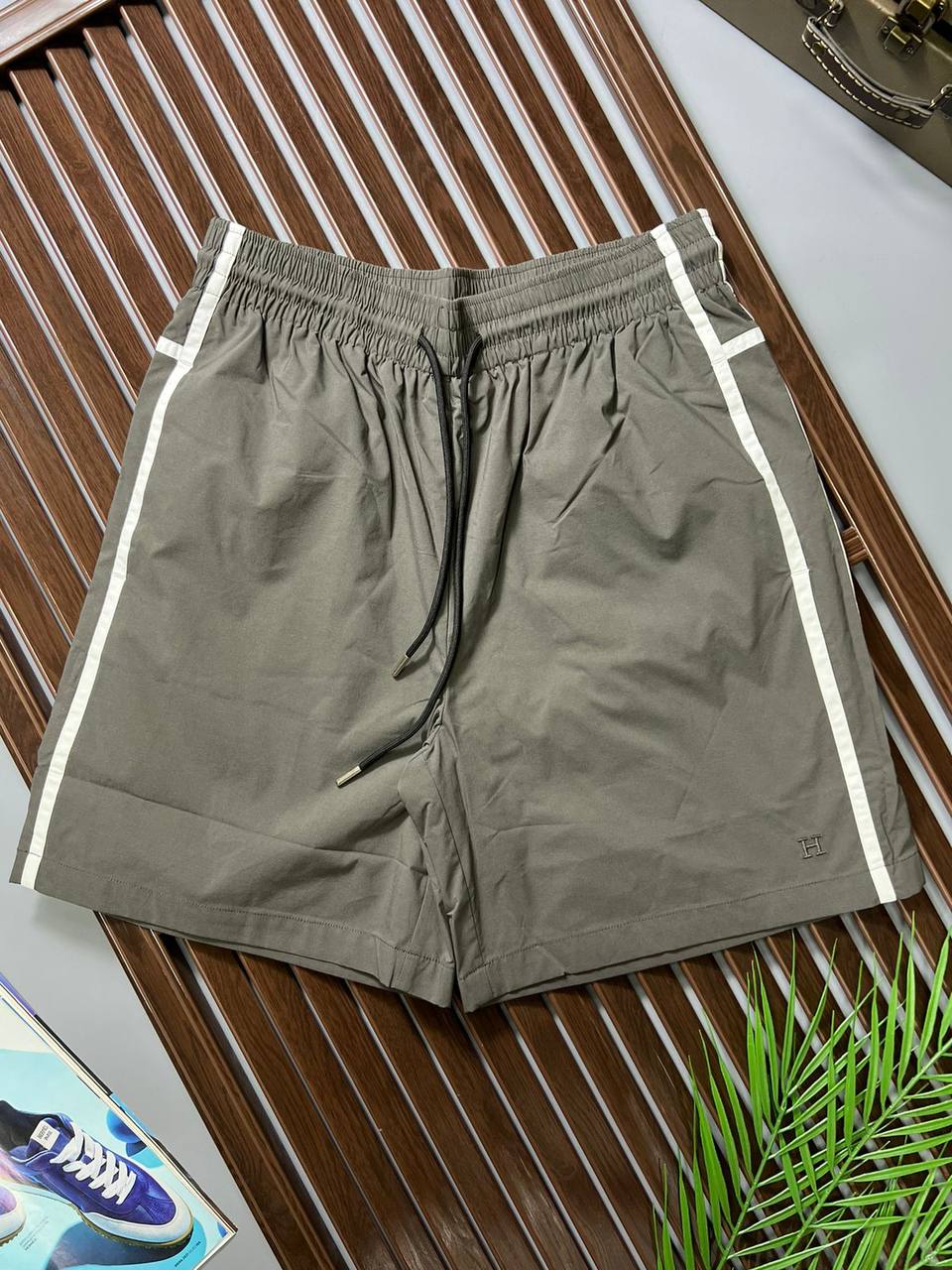 Шорты Hermes LUX-73167 — стильные шорты в спортивном стиле. Модель выполнена в серо-зеленом цвете с контрастными белыми полосками по бокам, что добавляет динамичности. Шорты идеально подойдут для повседневной носки, занятий спортом или отдыха.