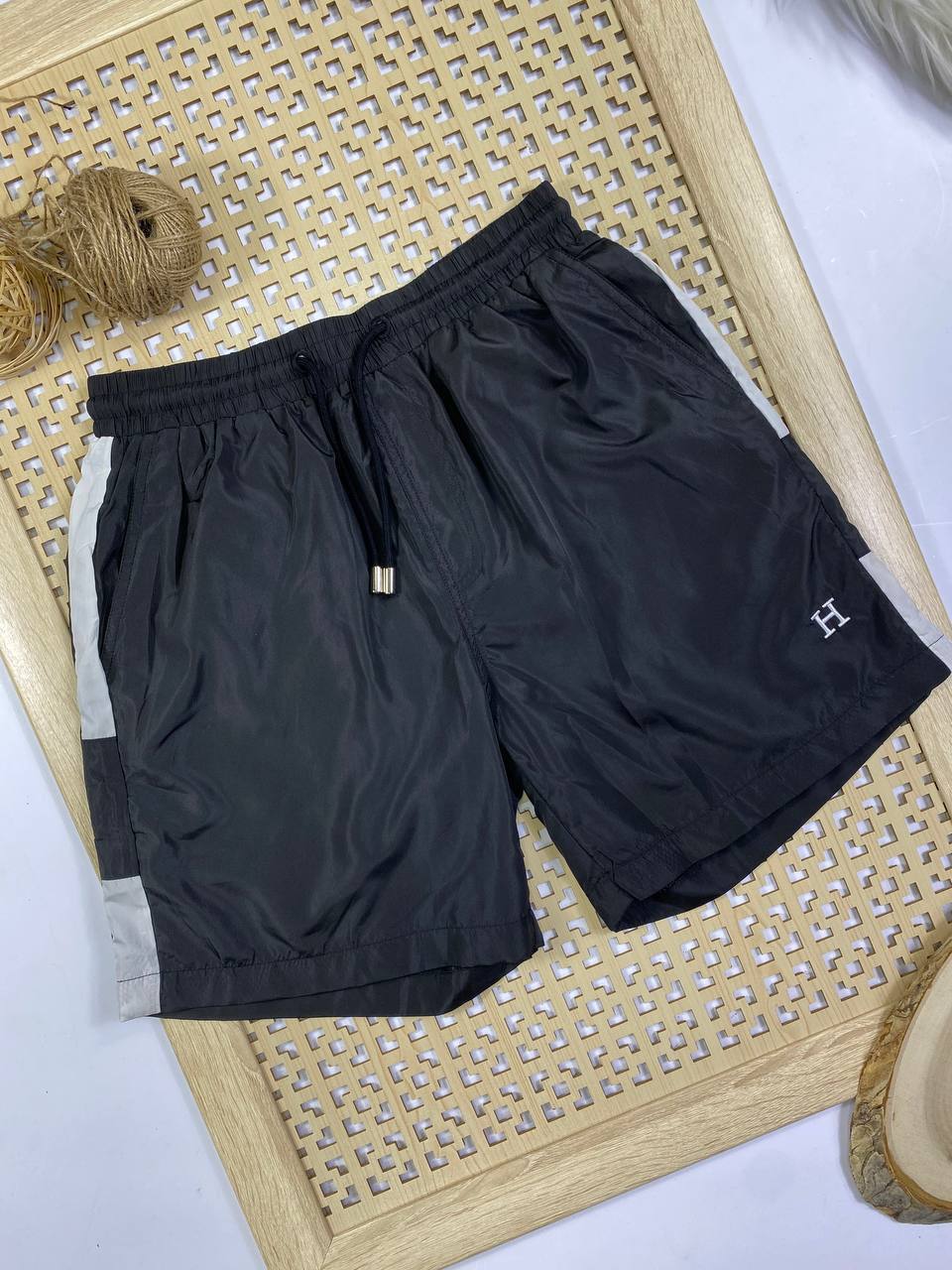 Шорты Hermes LUX-49978 представлены в классическом черном цвете с контрастными боковыми вставками. Модель отличается лаконичным дизайном, который подчеркивает элегантность бренда. Эластичный пояс с регулируемым шнурком обеспечивает идеальную посадку, а свободный крой гарантирует максимальный комфорт. Эти шорты станут отличным выбором для создания стильных повседневных и спортивных образов.