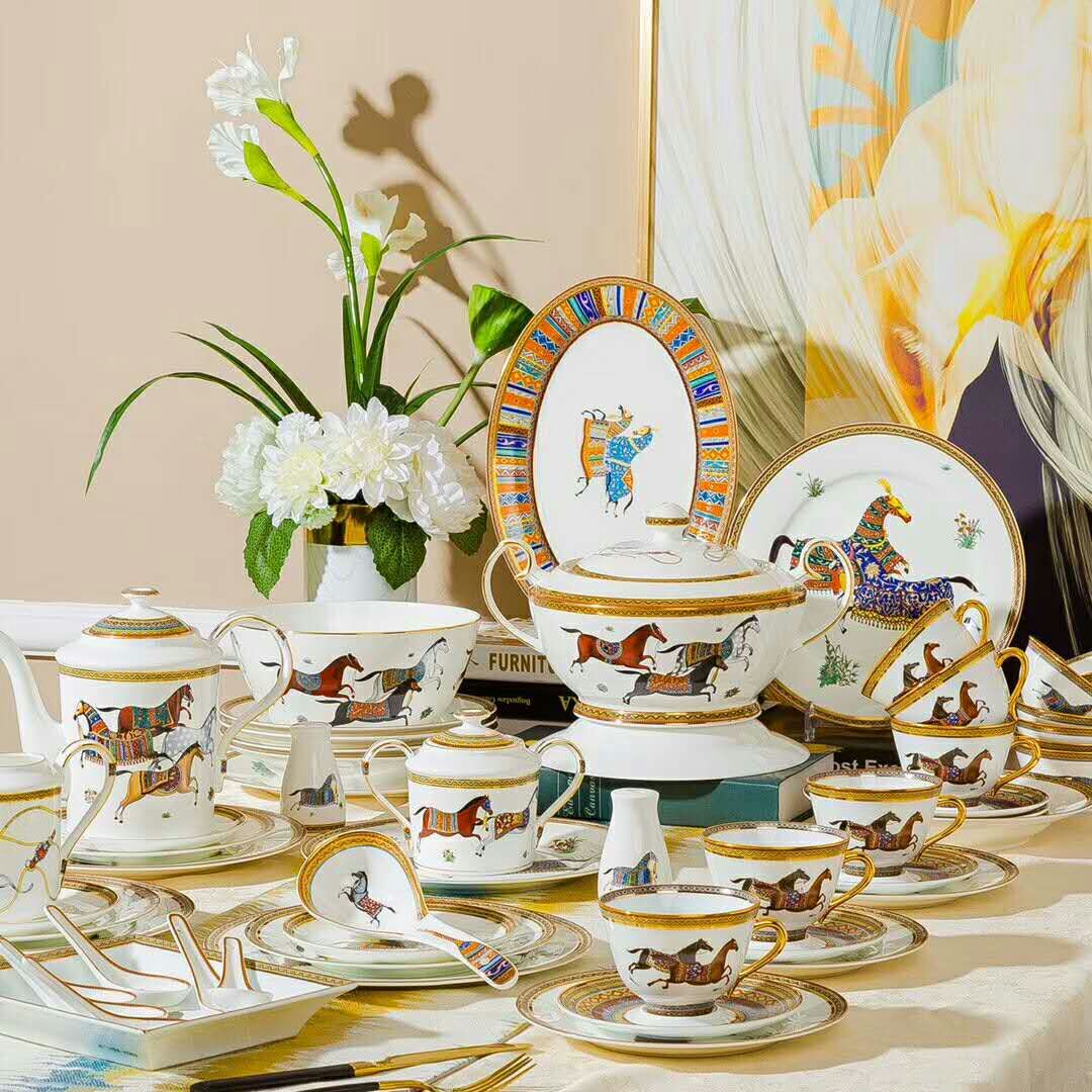 Столовый сервиз Hermes LUX-22133 – это элегантный набор посуды, который привнесет роскошь и изысканность в вашу сервировку. Дизайн, вдохновленный классическими мотивами, украшен изящными изображениями лошадей, что придает каждому предмету уникальный характер. Этот сервиз идеально подходит для особых случаев и станет центральным элементом праздничного стола, создавая атмосферу утонченности.