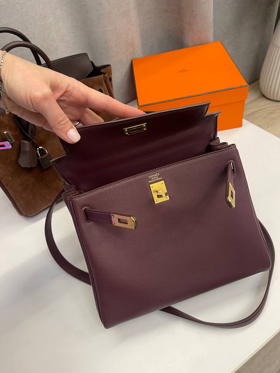 Сумка женская Kelly, 25 Swift Leather Hermes LUX-114177, представляет собой элегантную сумку в классическом стиле. Она выполнена в глубоком бордовом цвете с гладкой текстурой. Эта сумка идеально подходит для повседневного использования и станет отличным дополнением к любому образу.