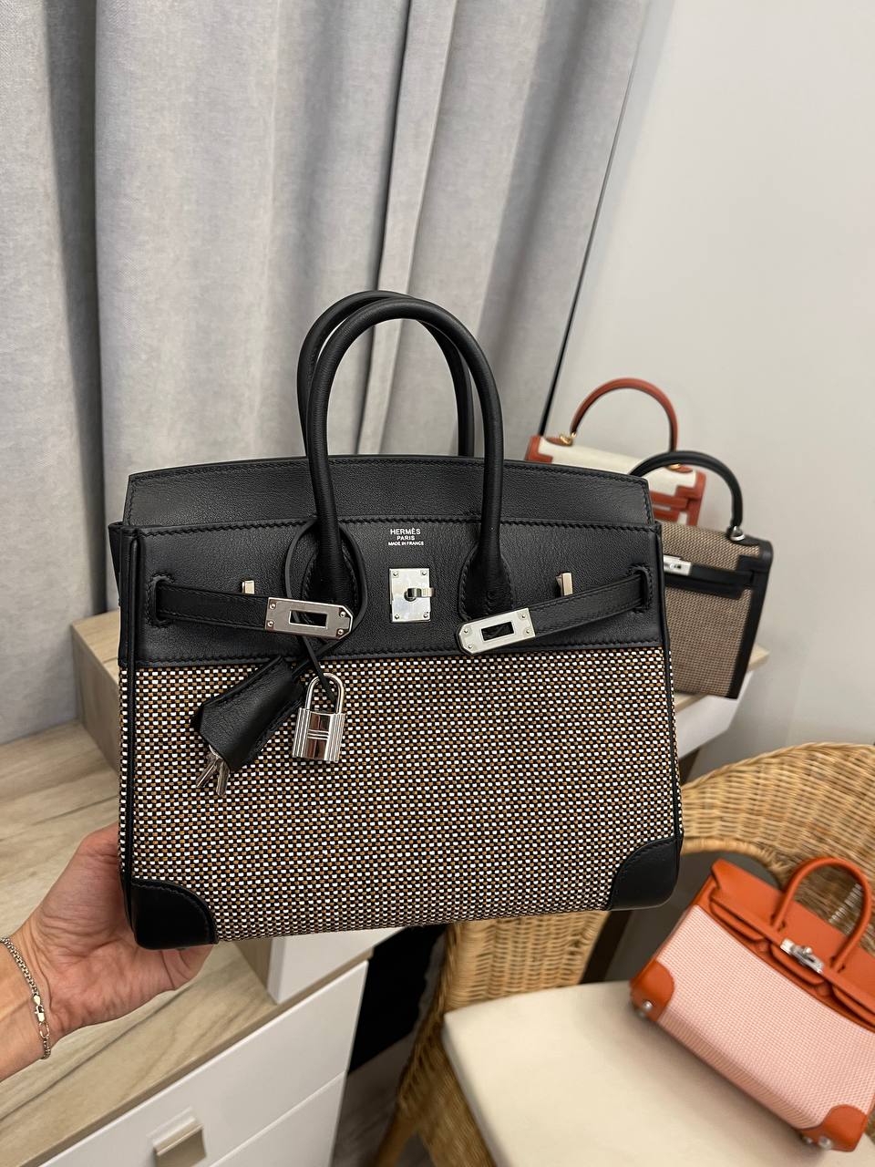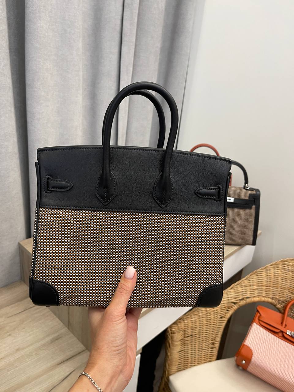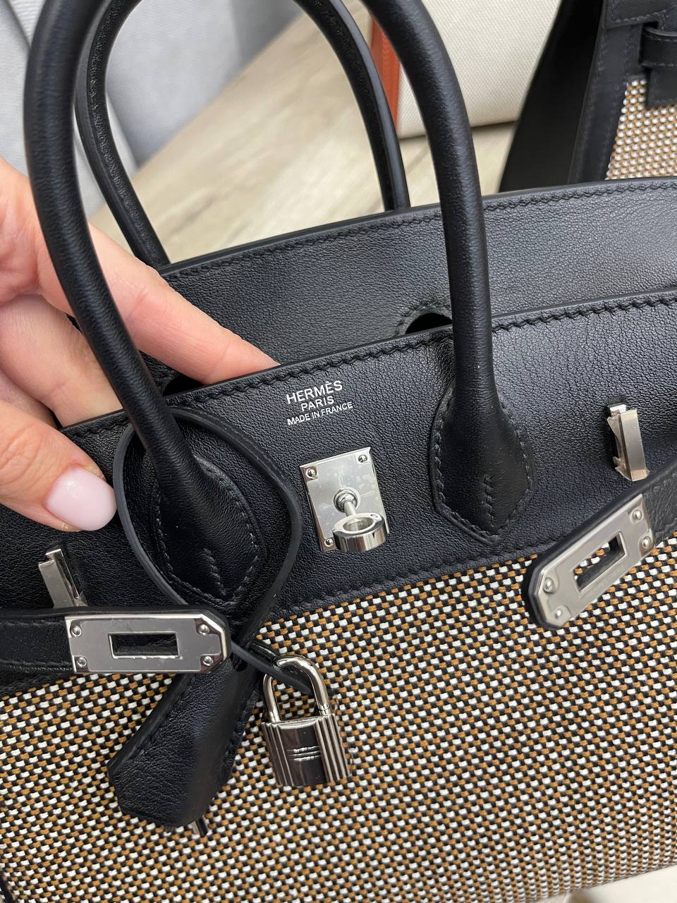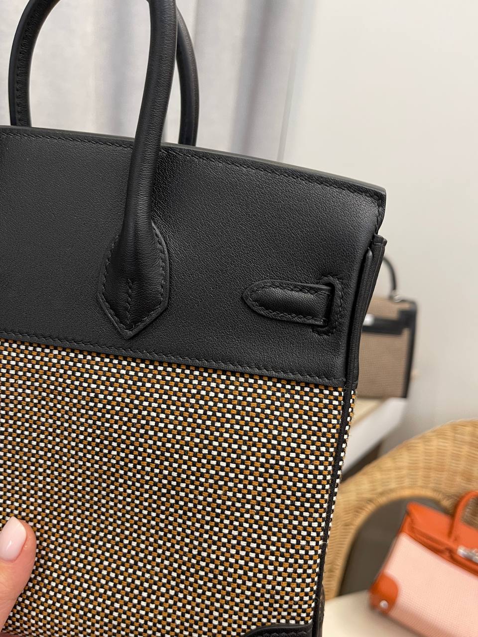 Сумка женская Birkin 25 Hermes LUX-112774 - это воплощение элегантности и утонченности. Сумка выполнена в классическом стиле, сочетая черный цвет кожи с тканевыми вставками. Она идеально подходит для повседневного использования, а также для особых случаев.