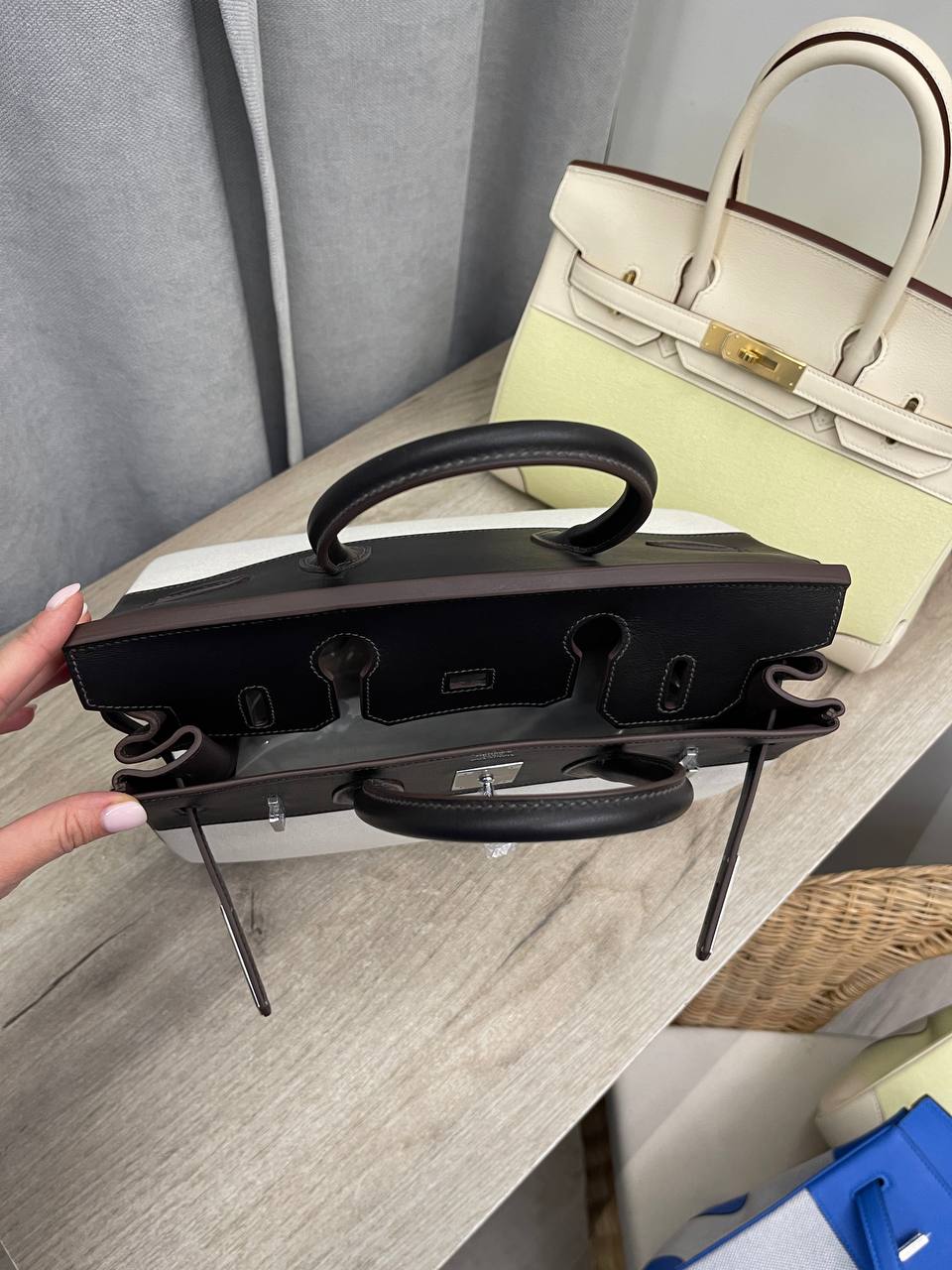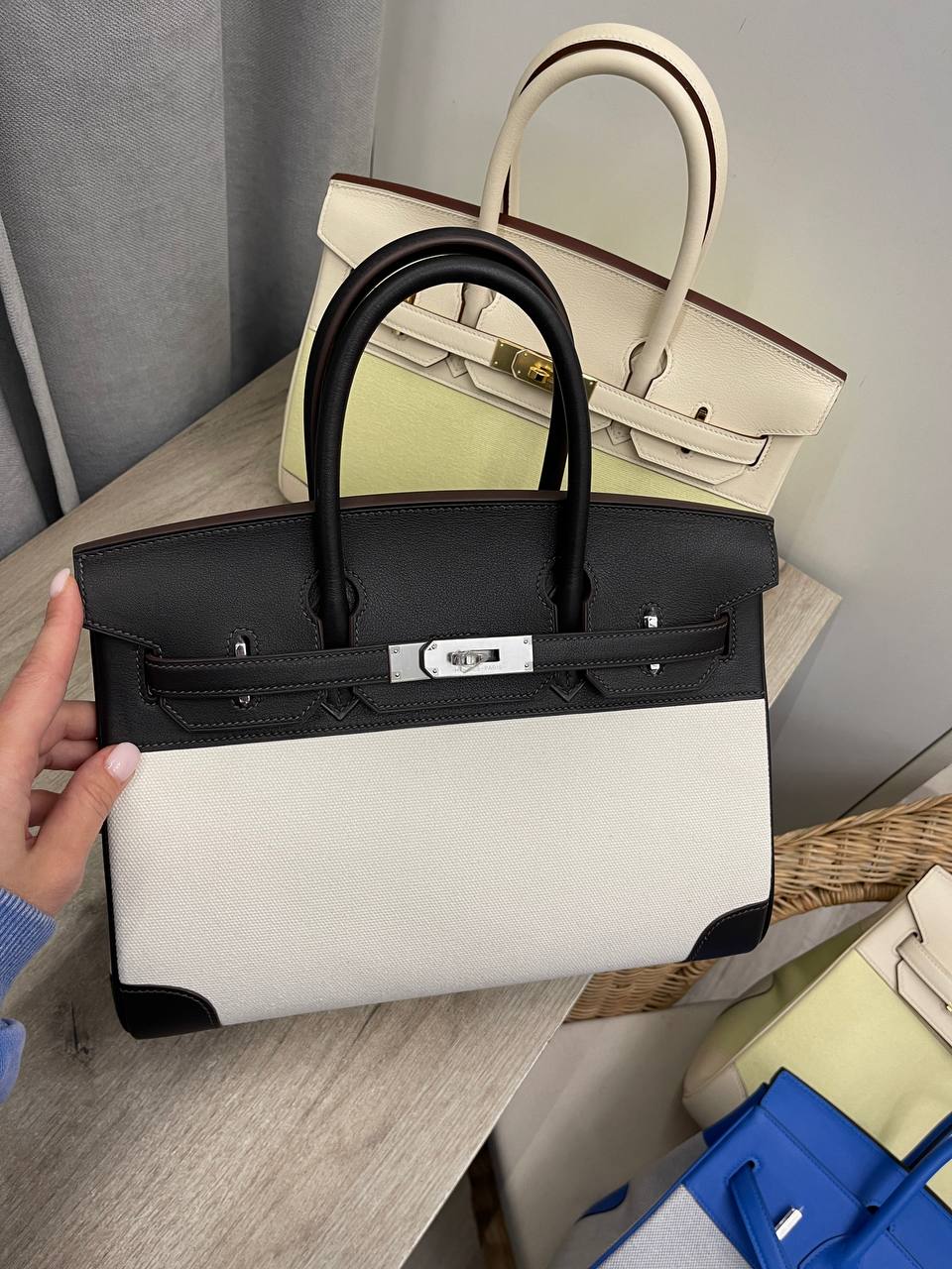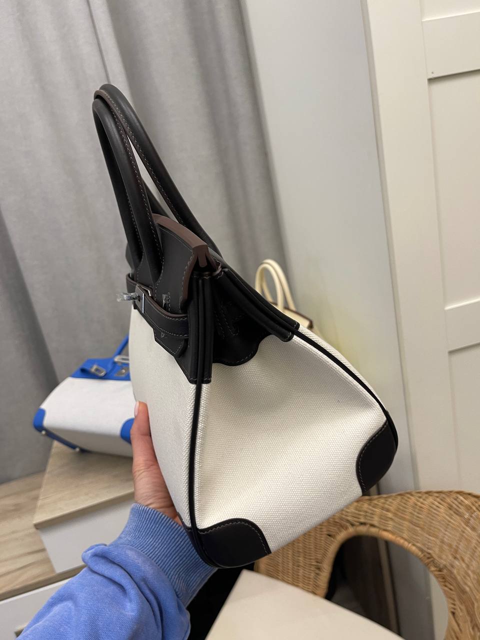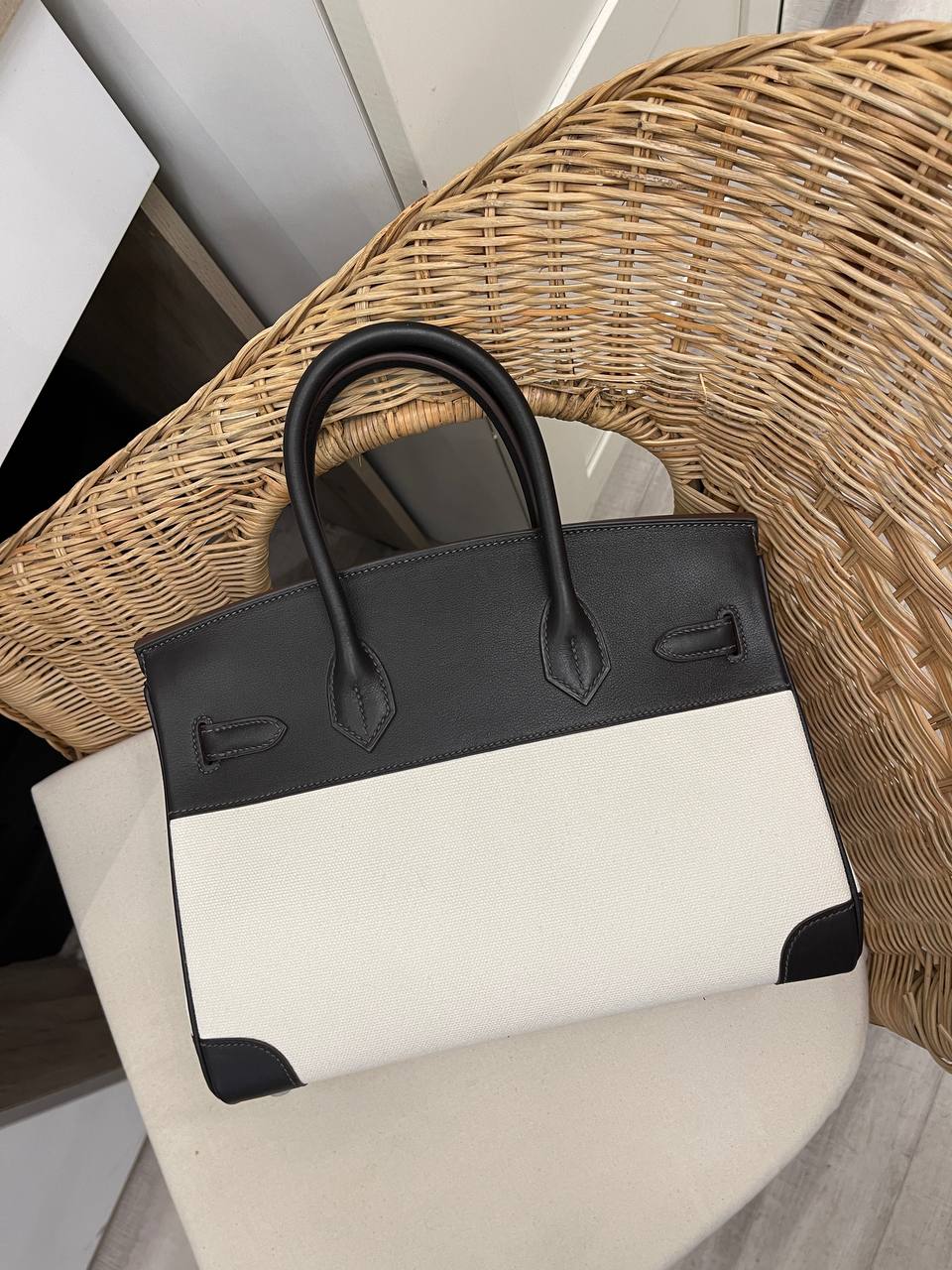 Сумка женская Birkin 30 cm LUX-112840 от Hermes – воплощение элегантности и стиля. Данная модель выполнена в классическом дизайне, сочетая в себе черный и белый цвета с контрастными деталями. Сумка имеет прямоугольную форму, что делает ее идеальным аксессуаром для повседневного использования или особых случаев.