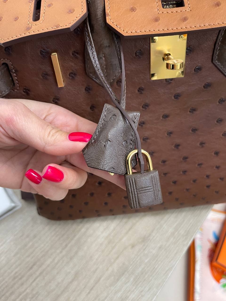 Сумка женская Birkin Ostrich GHW, 30 cm, GHW Hermes LUX-90304 - элегантная сумка, сочетающая в себе роскошь и функциональность. Сумка выполнена в классическом стиле Birkin, который ассоциируется с эксклюзивностью и статусом. Темно-коричневый цвет и текстурированная поверхность делают ее привлекательной и изысканной.