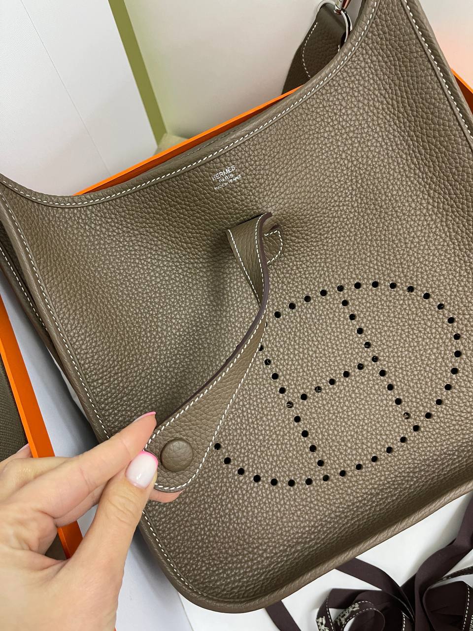 Сумка женская Evelyne 29 cm Clemence leather Hermes LUX-115459, выполнена в классическом стиле, подчеркивающем элегантность и изысканность. Сумка изготовлена в приглушенном серо-коричневом цвете, с узнаваемым перфорированным логотипом. Ее мягкая текстура делает ее идеальным аксессуаром для повседневного использования.