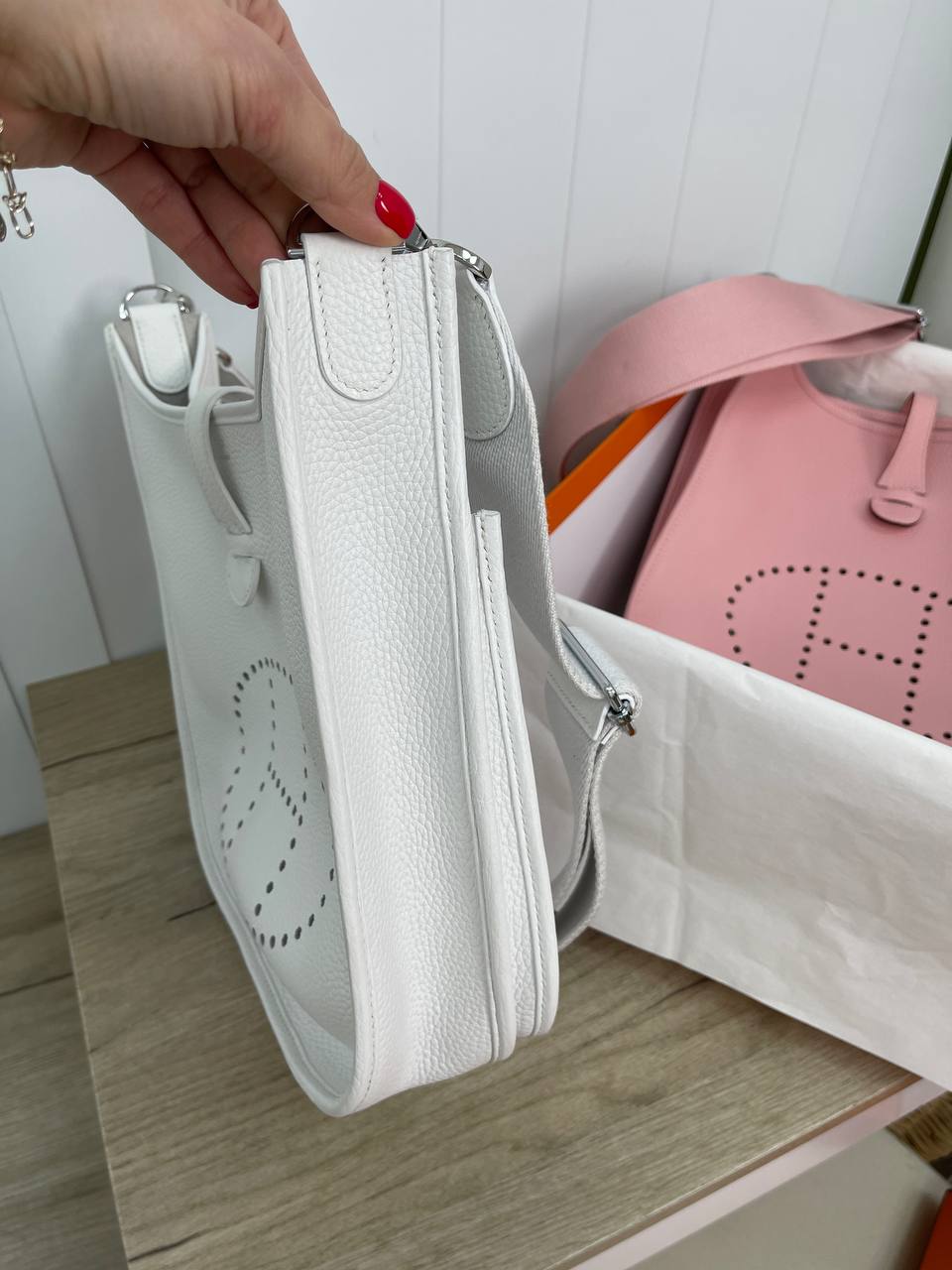 Сумка женская Evelyne 29 cm Clemence leather Hermes LUX-89307 - это стильная сумка через плечо, выполненная в белом цвете. Отличительной чертой является перфорированный логотип "H". Сумка сочетает в себе элегантность и функциональность, идеально подходя для повседневного использования.