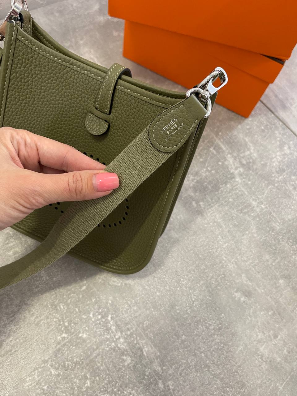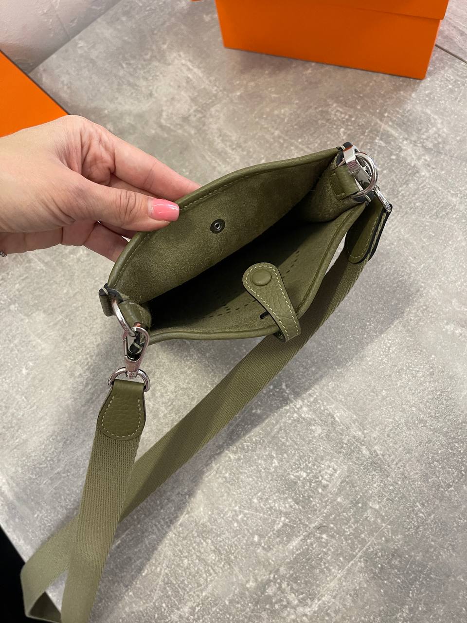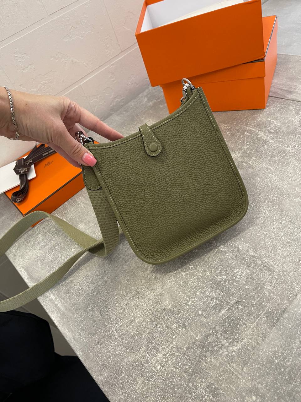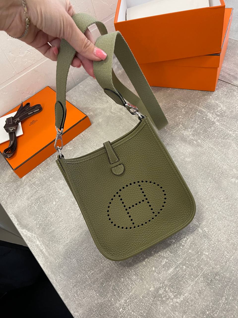Сумка женская Evelyne mini Hermes LUX-110095 — это элегантная сумка через плечо, выполненная в минималистичном стиле. Сумка имеет оливковый цвет и зернистую текстуру, что придает ей изысканный вид. Идеально подходит для повседневного использования и для создания стильных образов.