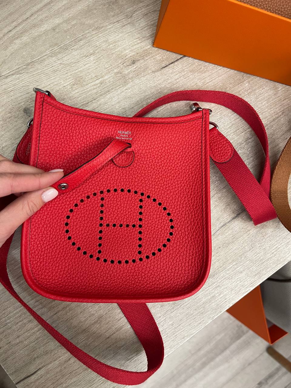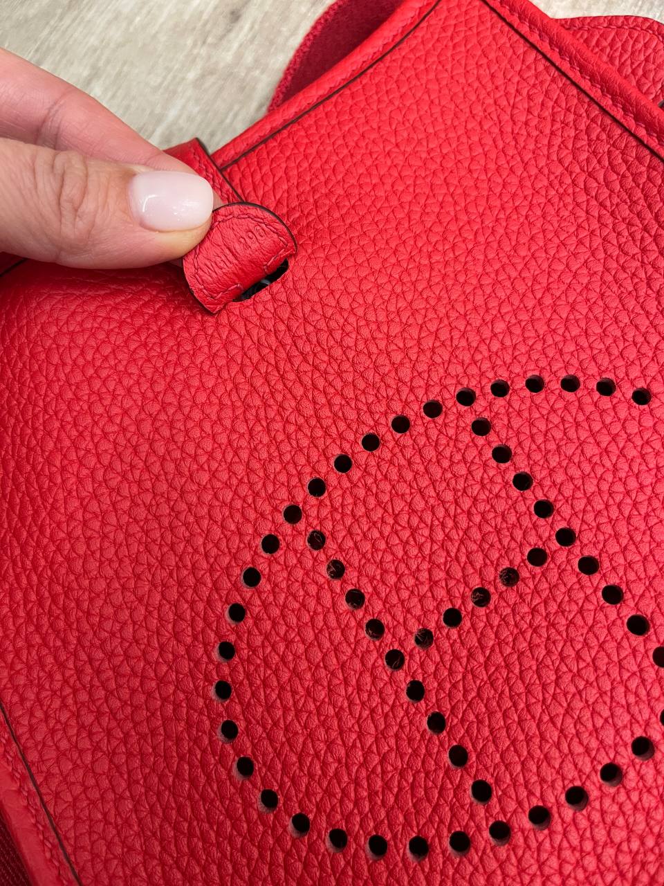 Сумка женская Evelyne mini Hermes LUX-114421 - это элегантная сумка через плечо от Hermes, выполненная в ярком красном цвете. Сумка имеет классическую форму с характерным перфорированным логотипом бренда. Она станет стильным дополнением к вашему образу, подчеркивая вашу индивидуальность.