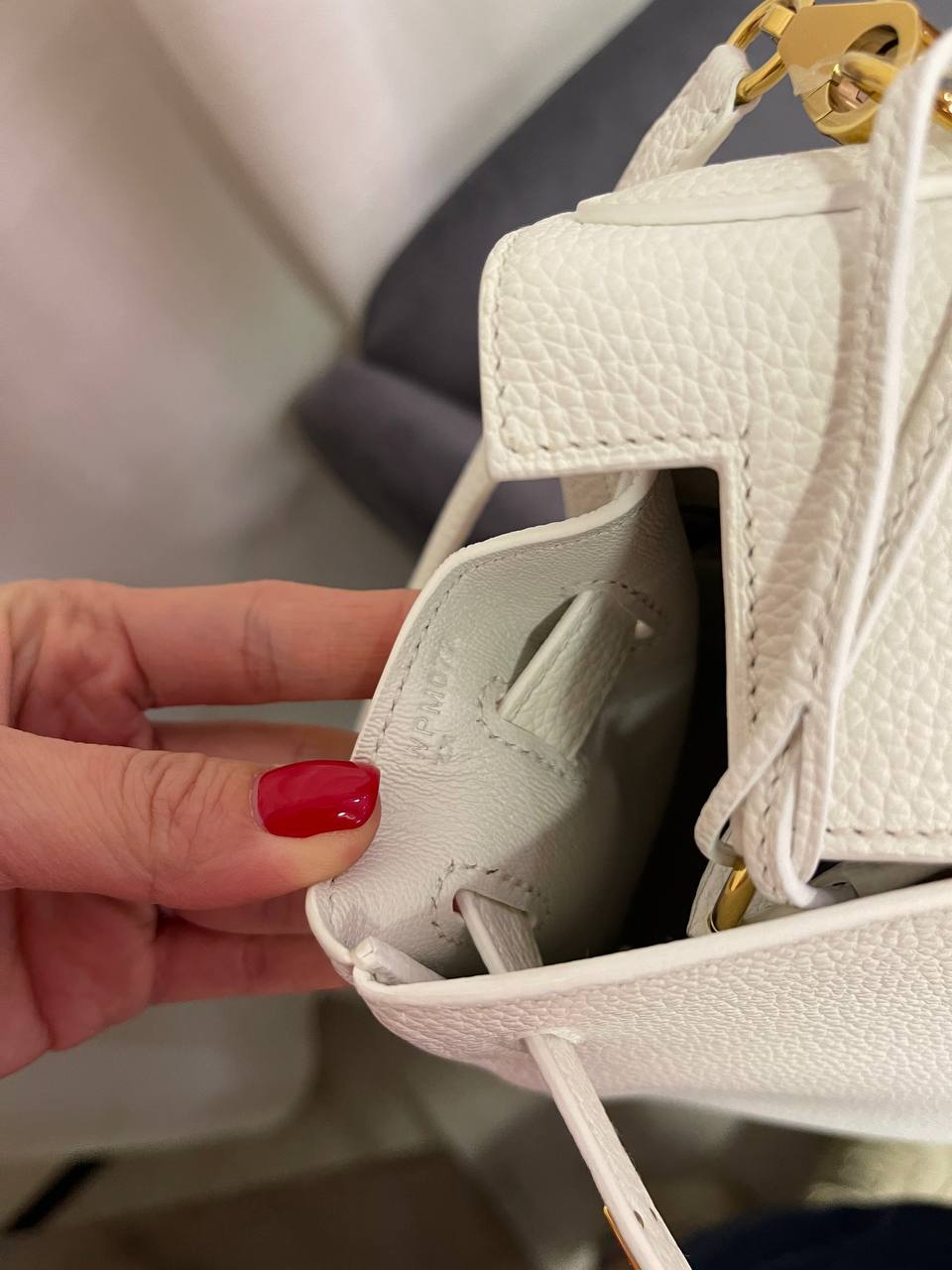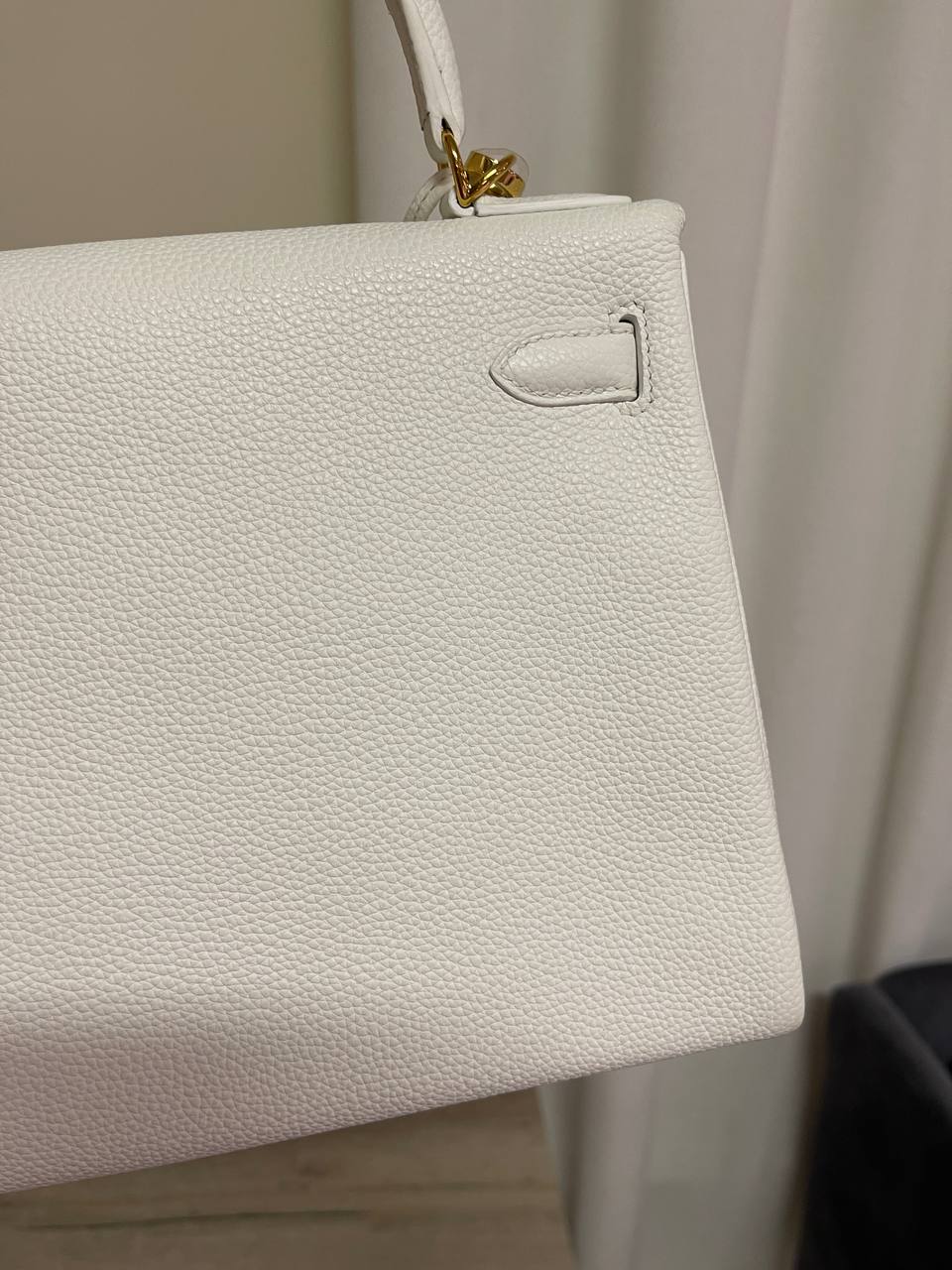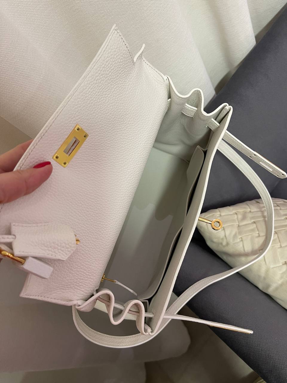 Сумка женская Kelly, 28, GHW Hermes LUX-118774 — элегантная сумка-трапеция от Hermes. Белый цвет с золотистой фурнитурой, а также зернистая текстура кожи придают ей изысканный вид. Она идеально подходит для повседневного использования или для особых случаев, подчеркивая безупречный вкус своей обладательницы.