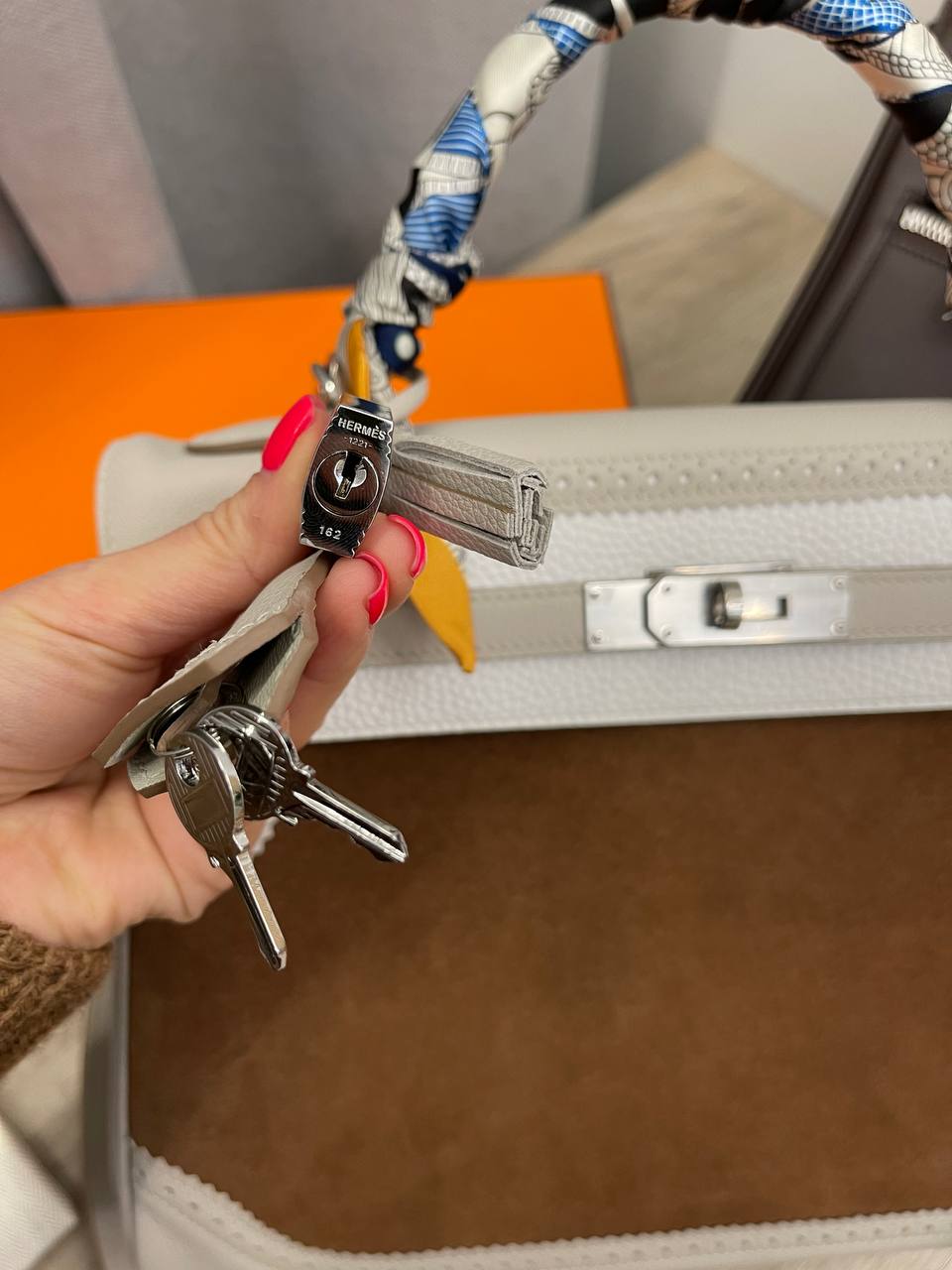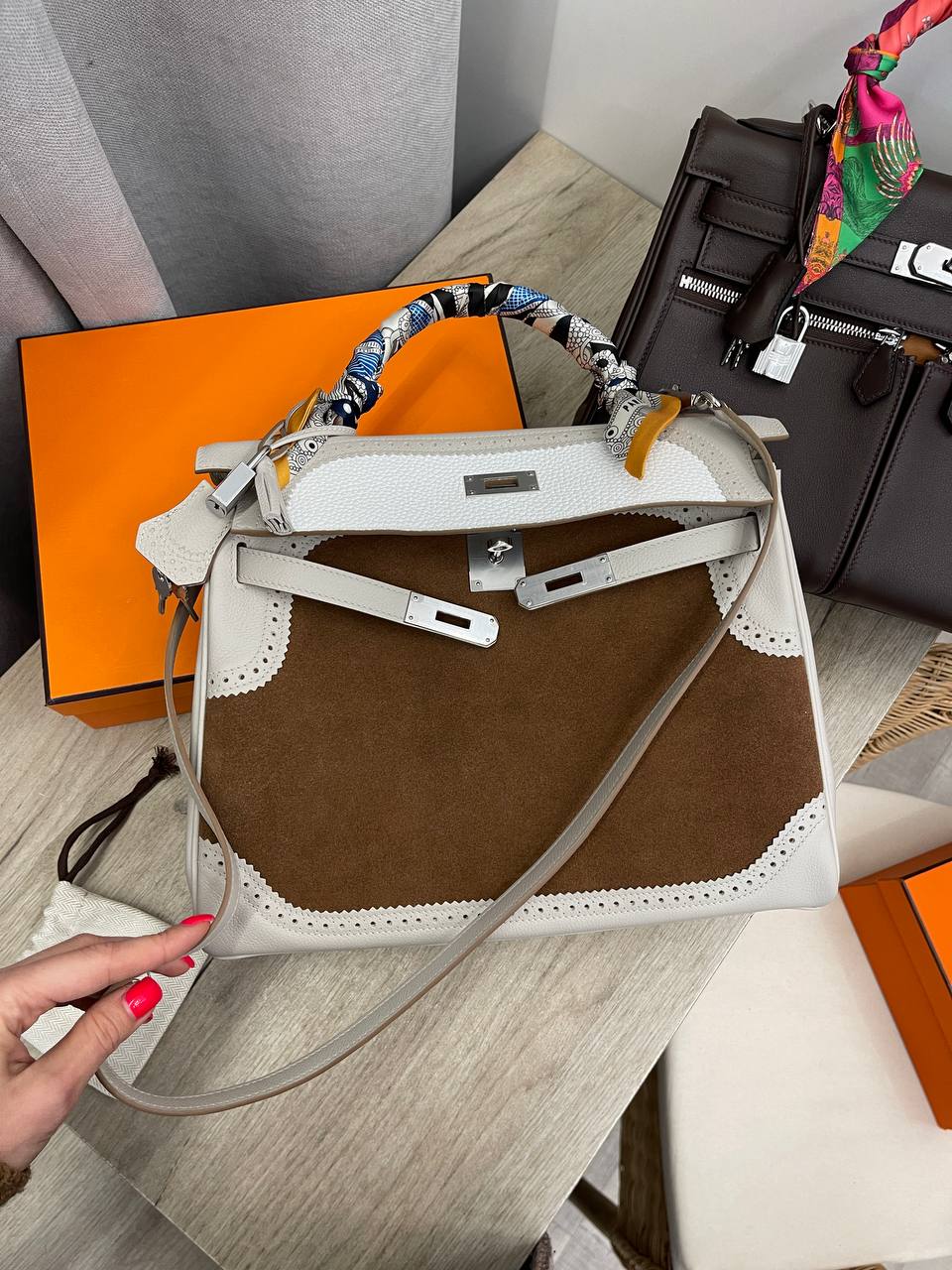 Сумка женская Kelly, 32 Hermes LUX-103588 — это элегантная сумка, сочетающая в себе классический стиль и современный дизайн. Сумка выполнена в комбинированном цвете: светло-сером с коричневыми вставками, что придает ей изысканный вид. Она идеально подходит для создания стильного образа на каждый день или для особых случаев.