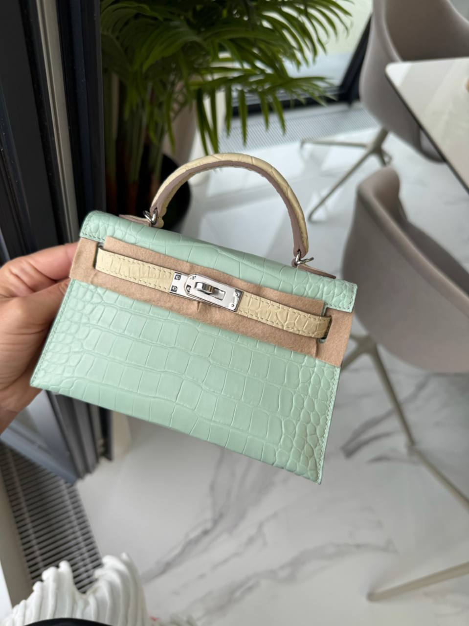 Сумка женская Kelly Mini Hermes LUX-113342 – это элегантный аксессуар, который воплощает в себе роскошь и изысканность. Сумка выполнена в мятном цвете с имитацией фактуры крокодиловой кожи, что придает ей уникальный внешний вид. Kelly Mini идеальна для создания неповторимого образа.