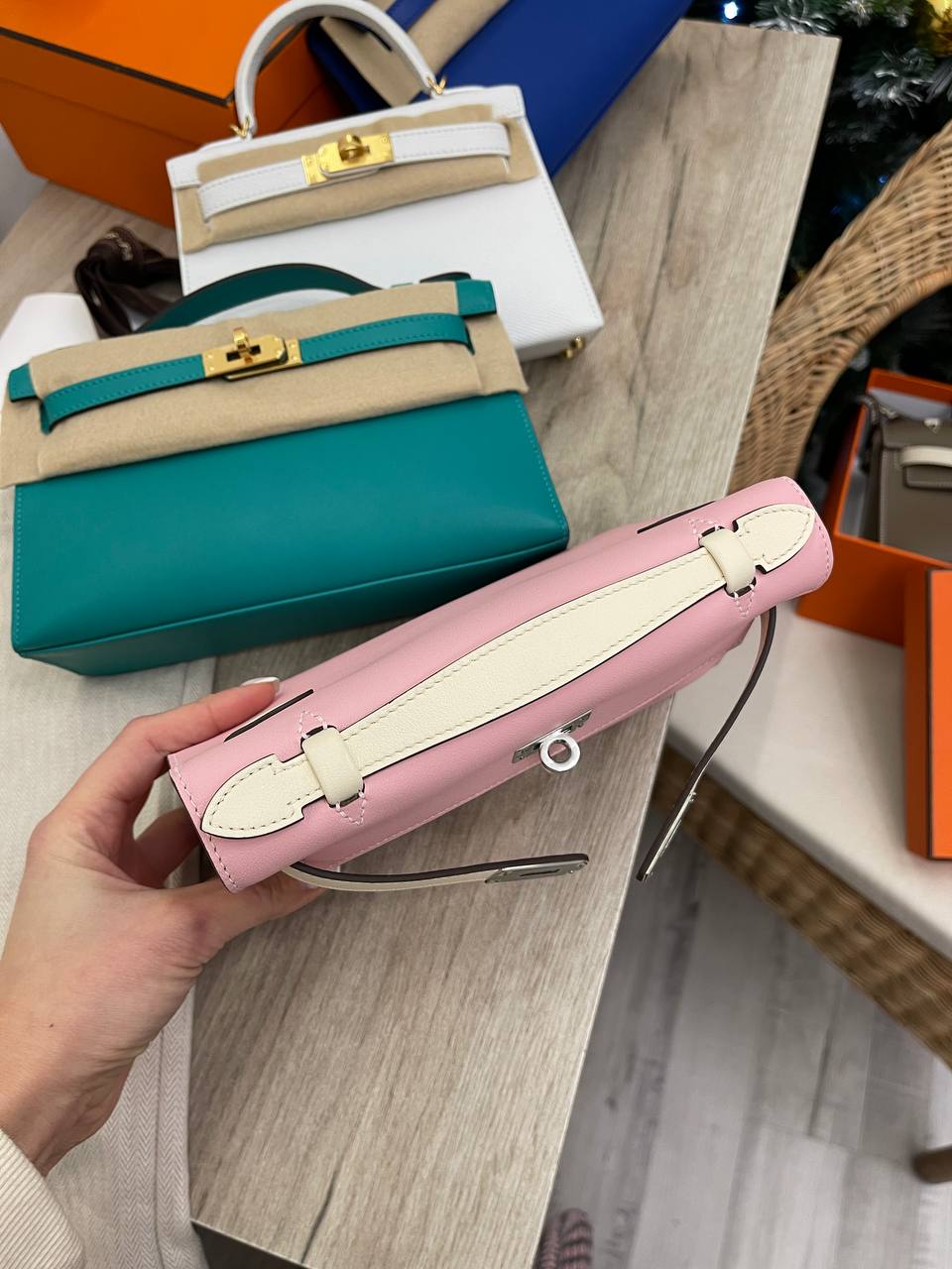 Сумка женская Kelly Pochette Hermes LUX-100348 — элегантный аксессуар для современных женщин. Сумка выполнена в нежно-розовом цвете, что придает ей изысканный и женственный вид. Kelly Pochette идеально подходит для вечерних выходов, светских мероприятий, а также для создания стильных повседневных образов.