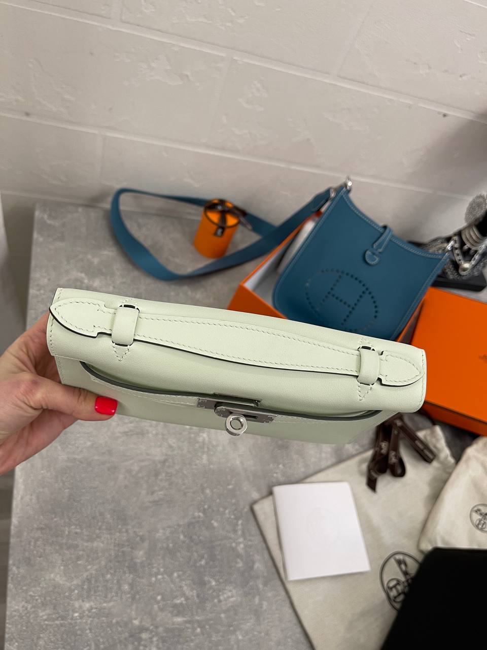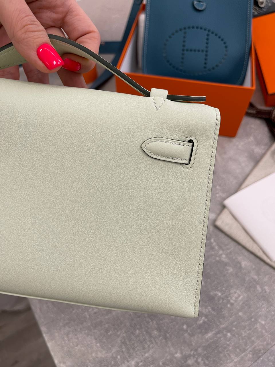 Сумка женская Kelly Pochette Hermes LUX-102857 выполнена в классическом стиле. Она представлена в светло-зеленом цвете с гладкой текстурой. Сумка-клатч идеально подойдет для вечерних выходов и особых случаев.