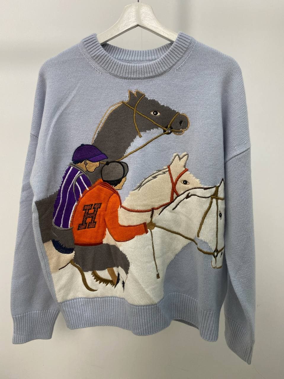 Свитер женский Hermes LUX-56913 представляет собой стильный и оригинальный элемент гардероба, выполненный в тематике конных скачек. Светло-голубой фон свитера выгодно подчеркивает яркую аппликацию с изображением жокеев и лошадей, создавая уникальный образ. Этот свитер идеально подойдет для создания эффектных повседневных и кэжуал образов.