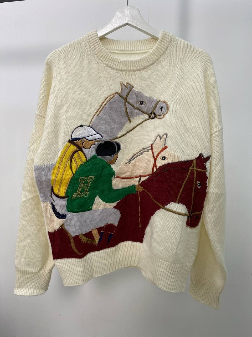 Свитер женский Hermes LUX-56914 — это изысканное трикотажное изделие, выполненное в классическом стиле. Оригинальный дизайн с аппликацией в виде лошадей и жокеев придает модели неповторимый шарм. Этот свитер станет стильным дополнением к вашему повседневному гардеробу, подчеркивая вашу индивидуальность и утонченный вкус.