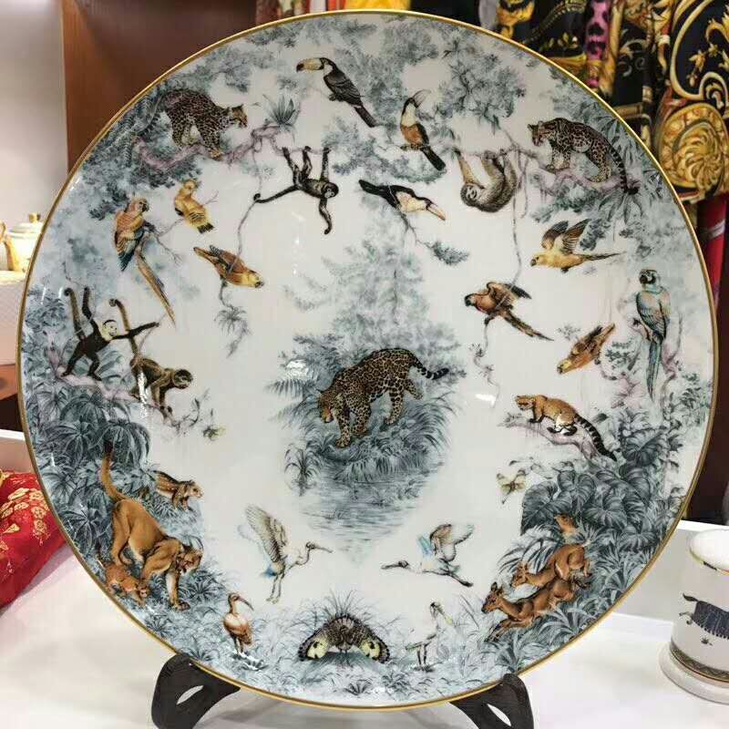 Эта тарелка Hermes LUX-22146 от Hermes отличается изысканным дизайном, изображающим сцену из дикой природы с разнообразными животными, такими как леопарды, обезьяны, птицы и олени, выполненную в стиле, напоминающем классическую французскую роспись. Она станет элегантным дополнением к сервировке стола или изысканным элементом декора.