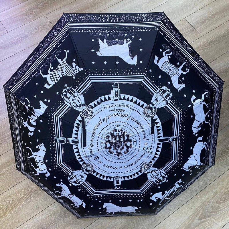 Зонт Hermes LUX-50597 представляет собой стильный аксессуар с оригинальным дизайном, отражающим элегантность бренда Hermes. Черный купол украшен черно-белым принтом с изображением лошадей, упряжи и фирменных деталей, что придает ему изысканный вид. Этот зонт станет не только надежной защитой от непогоды, но и модным дополнением к вашему образу.