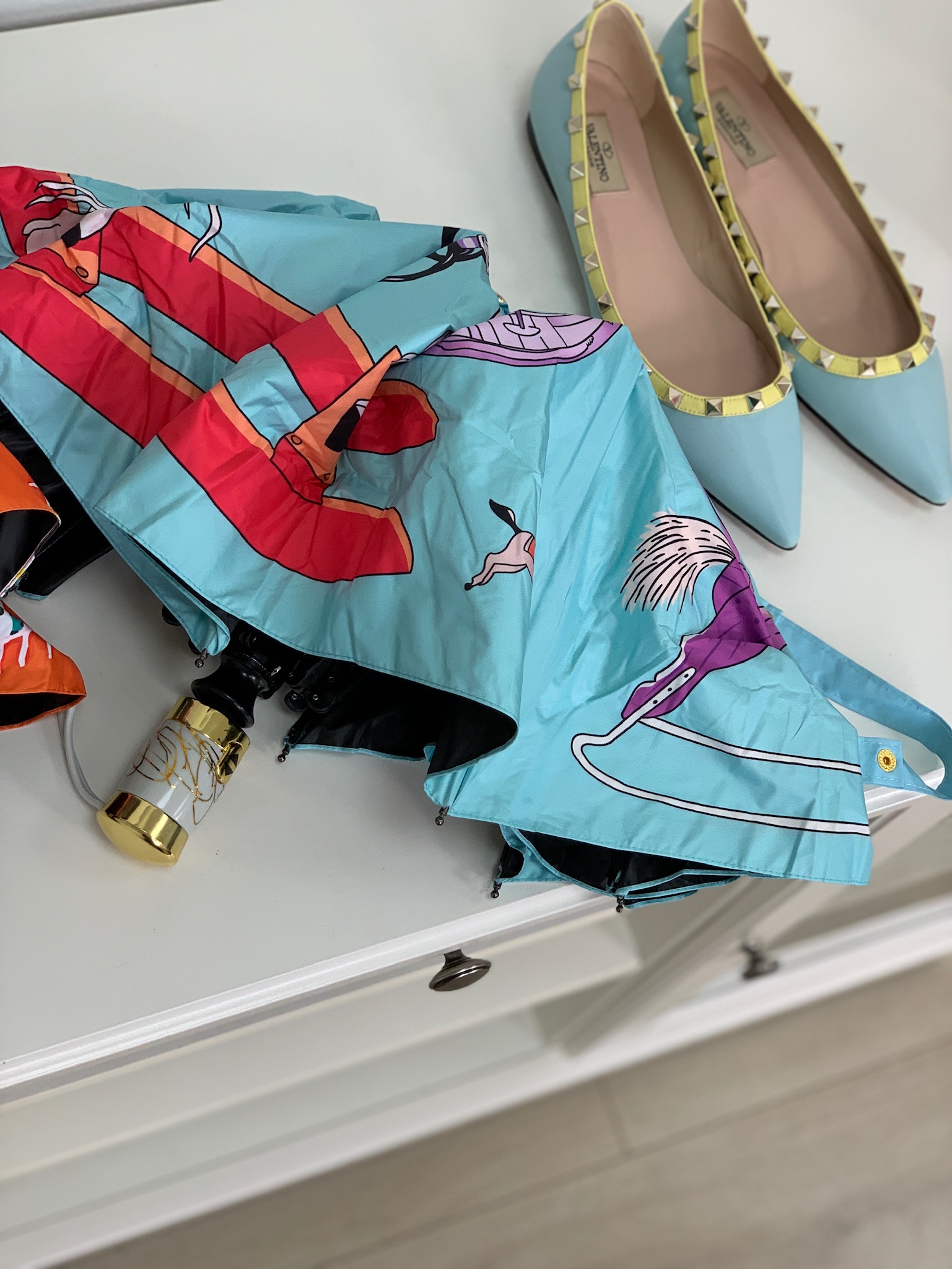 Зонт Hermes LUX-18311 представляет собой стильный и яркий аксессуар, выполненный в бирюзовом цвете с оригинальным принтом, включающим элементы одежды и фигурки животных. Его дизайн сочетает в себе практичность и модные тенденции, что делает его отличным дополнением к любому образу. Благодаря компактным размерам в сложенном виде, он легко помещается в сумку.