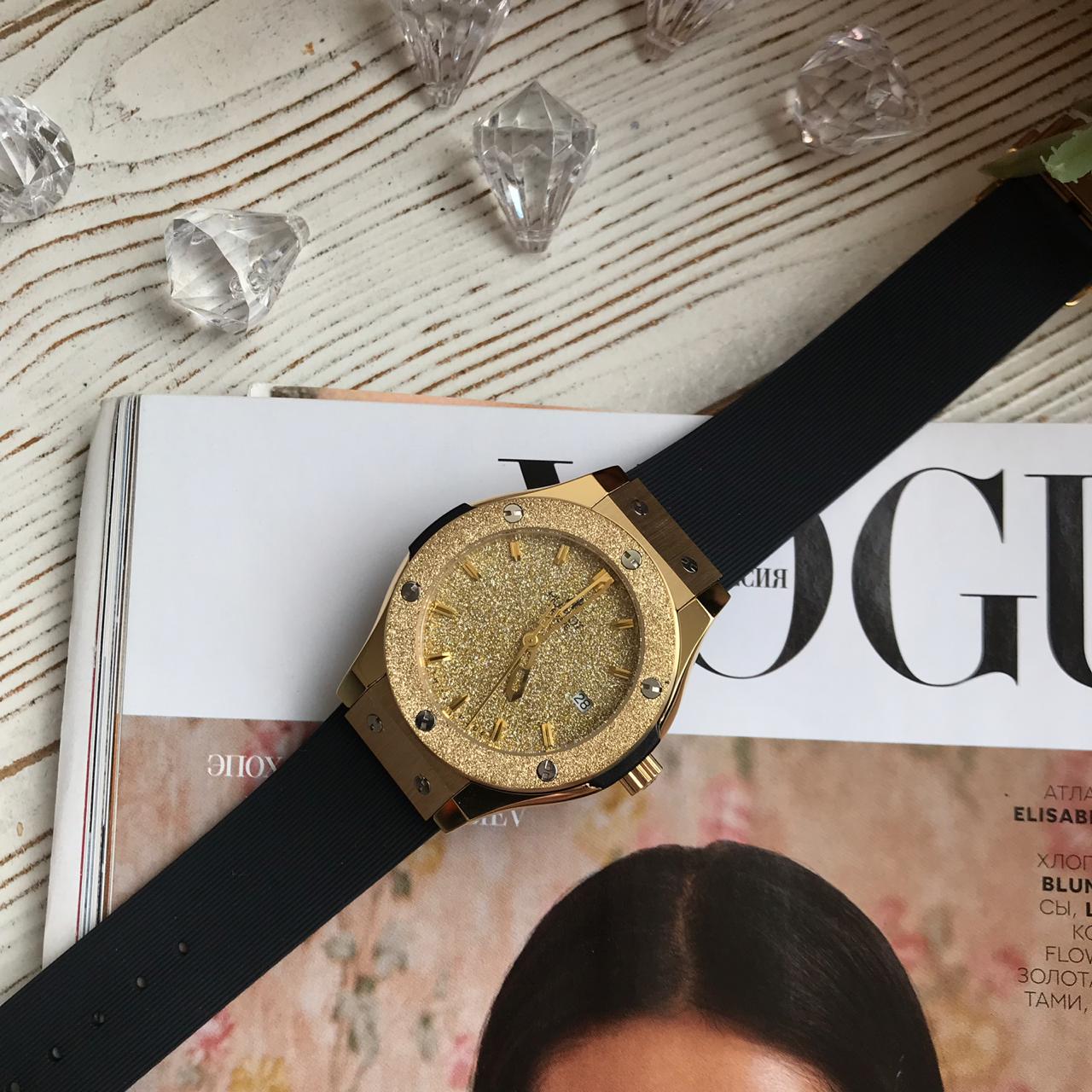 Часы Hublot LUX-7889 представляют собой элегантный и роскошный аксессуар, выполненный в золотистом цвете. Дизайн корпуса и циферблата, инкрустированного мерцающими элементами, придает часам изысканный вид. Черный ремешок обеспечивает комфортное ношение, а узнаваемый стиль Hublot делает их заметным дополнением к любому образу, от делового до вечернего.