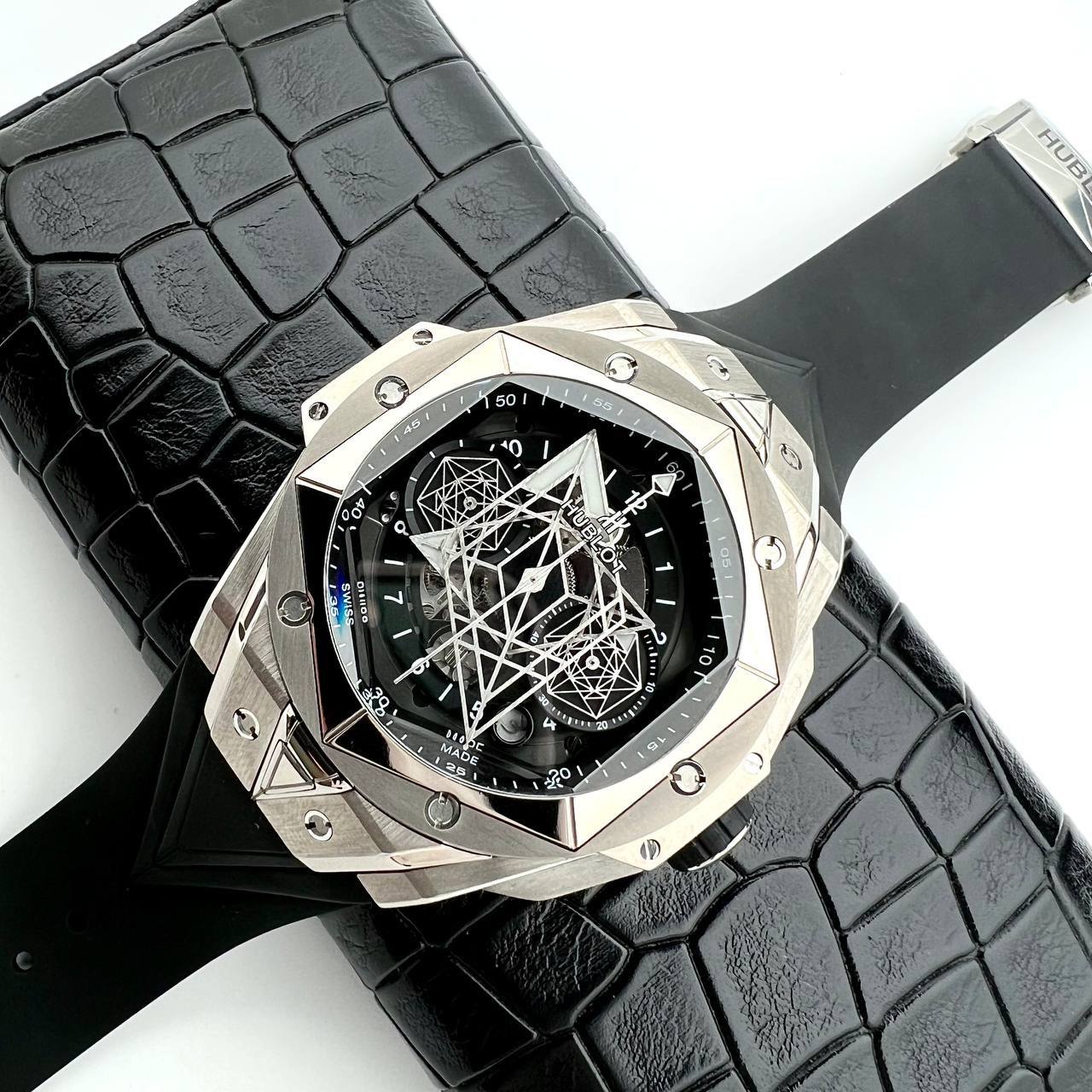 Часы Hublot LUX-87848 — это современный аксессуар, который сочетает в себе элегантный дизайн и функциональность. Черный ремешок и корпус часов гармонируют с металлическими элементами циферблата, создавая эффектный контраст. Этот аксессуар станет отличным дополнением к любому образу.