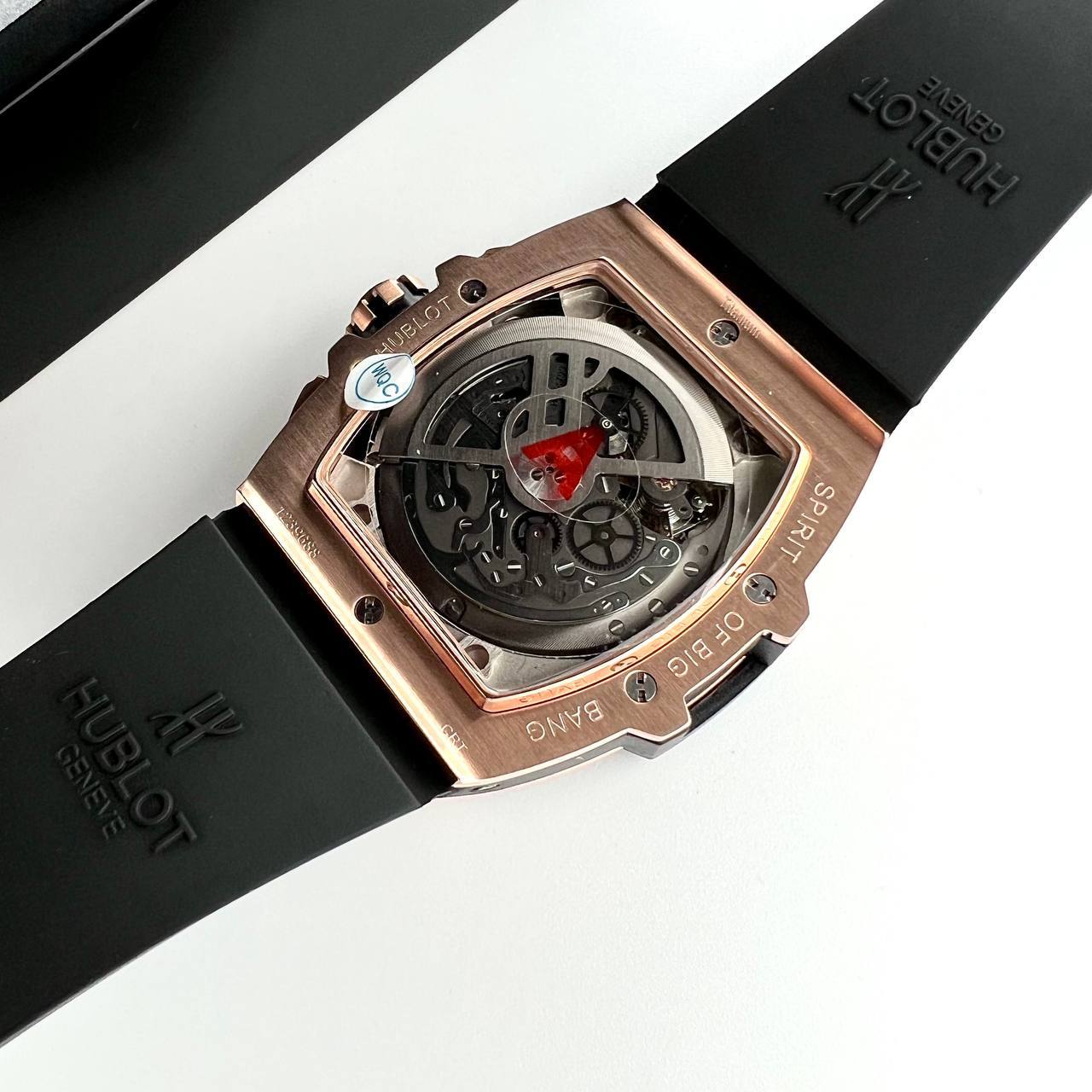 Часы Hublot LUX-89633 представляют собой роскошный аксессуар с современным дизайном. Чёрный циферблат с контрастными элементами сочетается с корпусом из розового золота, создавая элегантный вид. Чёрный ремешок обеспечивает комфорт при ношении и гармонично дополняет общий стиль часов.