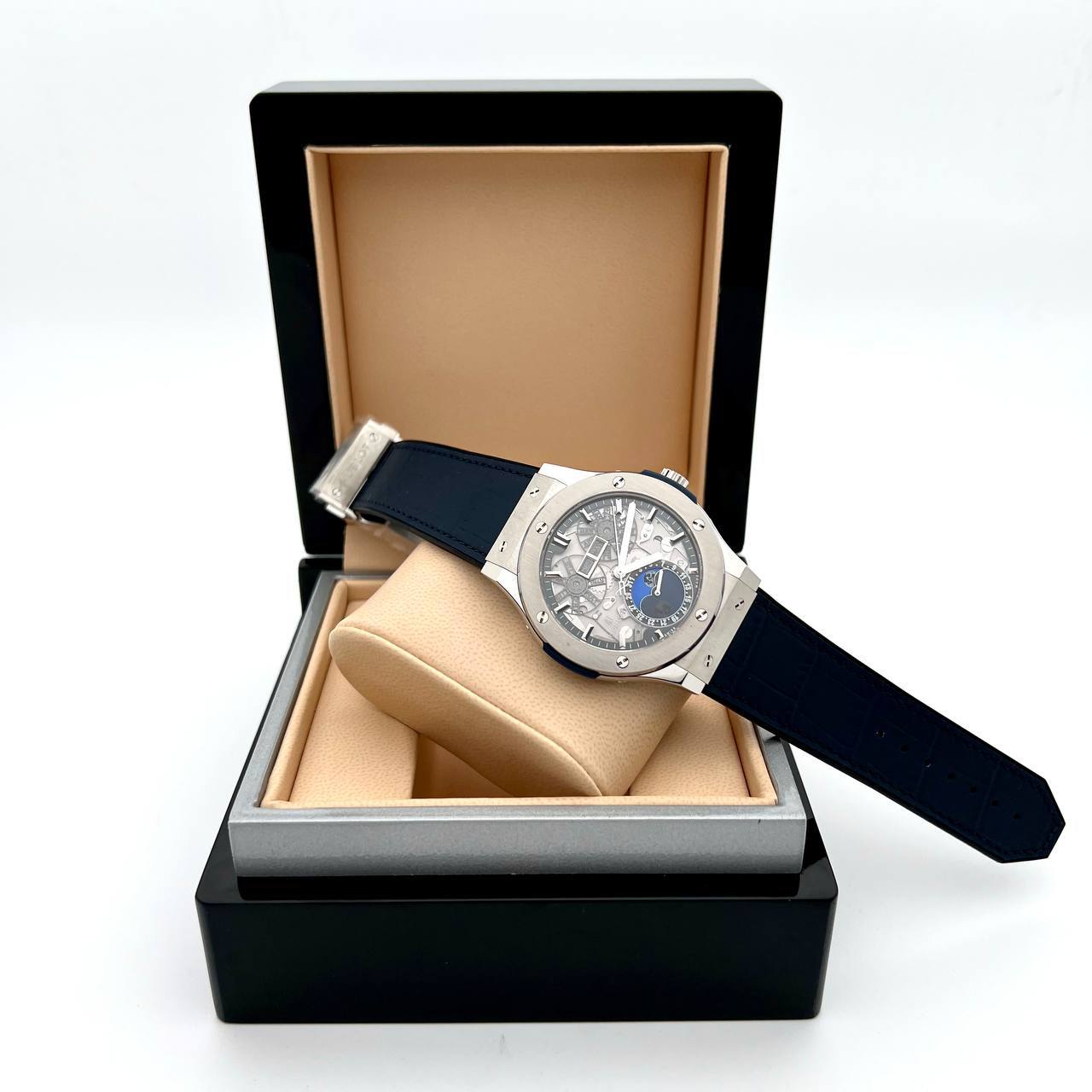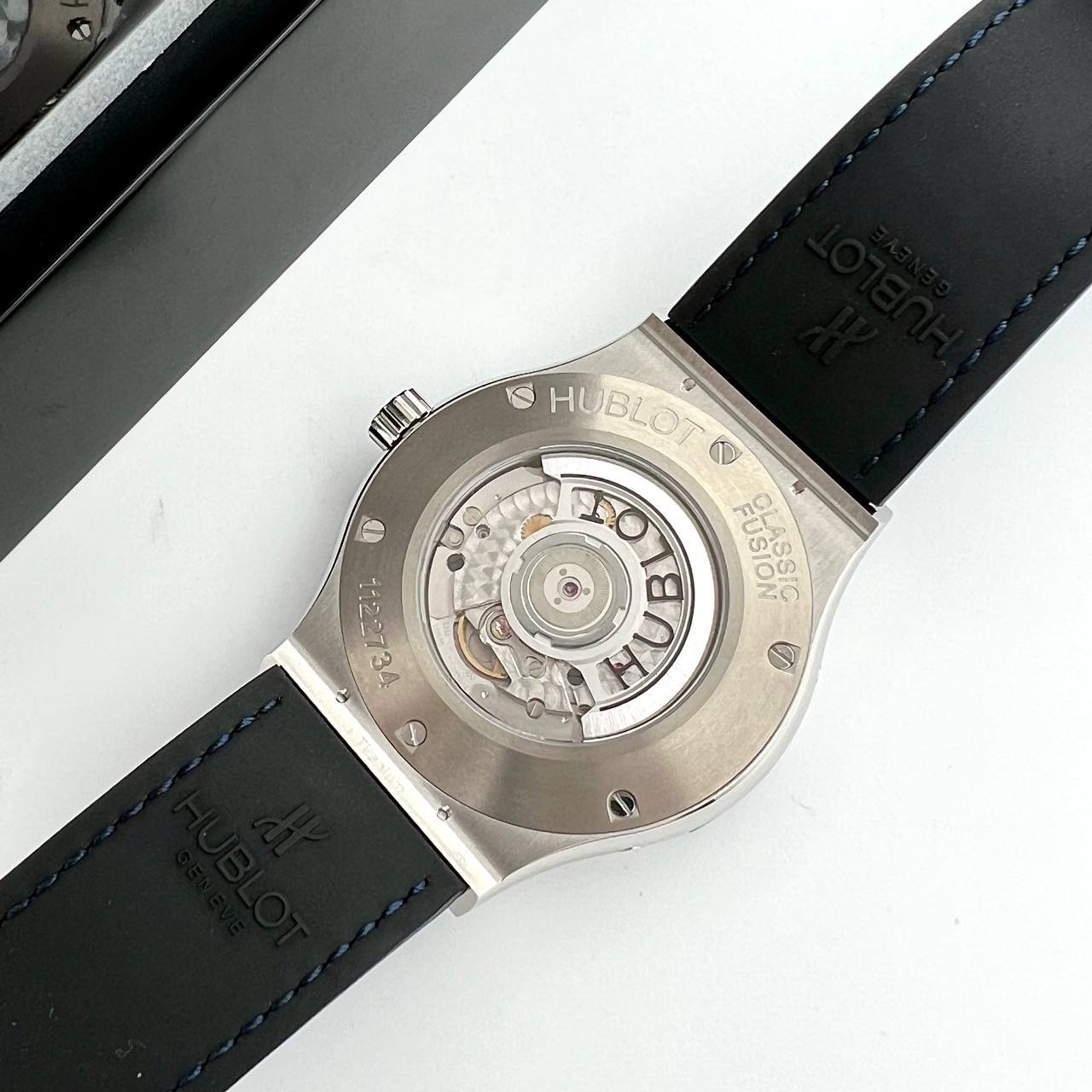 Часы Hublot LUX-89636 - это воплощение роскоши и инноваций, представленные в современном дизайне. Часы имеют серебристый корпус с черным ремешком. Скелетонизированный циферблат демонстрирует сложный механизм.