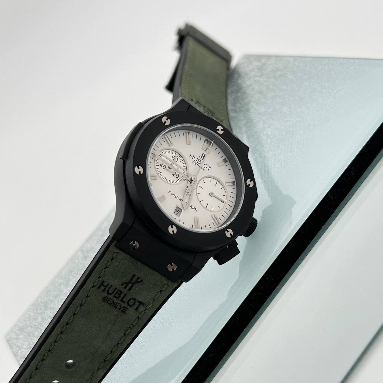 Часы Hublot LUX-109915 представляют собой элегантный хронограф в спортивном стиле. Чёрный корпус контрастирует с серебристым циферблатом, а зелёный ремешок добавляет изюминку. Идеально подойдут для создания стильного образа.