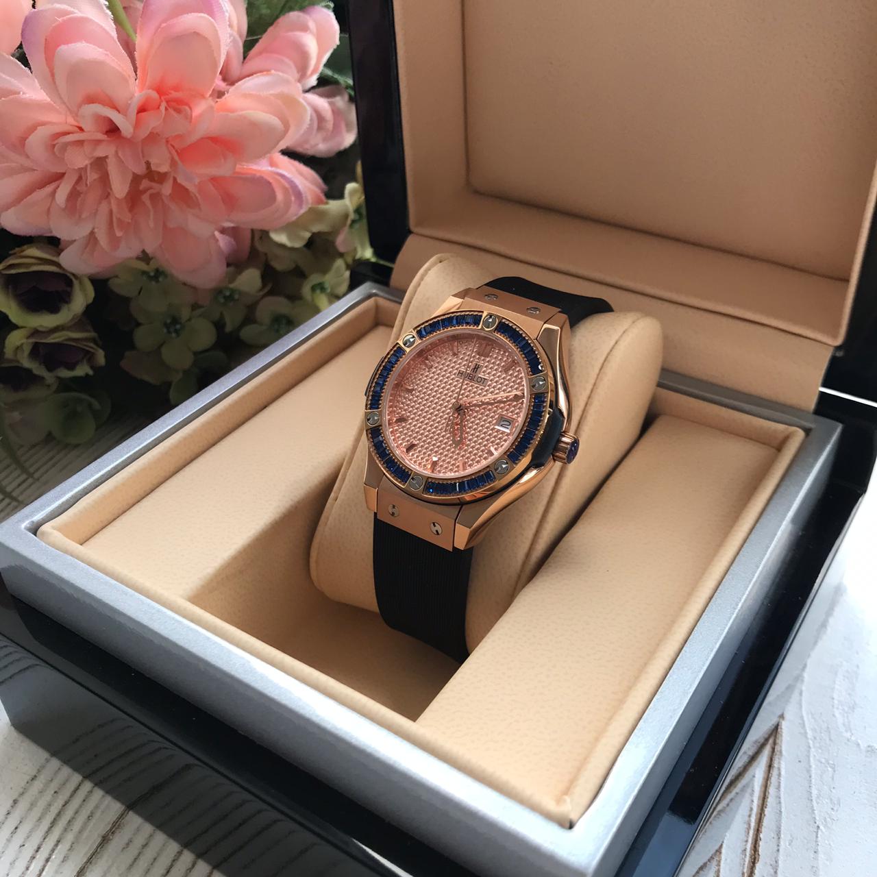 Часы женские Hublot LUX-16221 – это элегантный аксессуар, сочетающий в себе роскошный дизайн и высокое качество. Корпус из розового золота, украшенный синими кристаллами по ободку, придает часам изысканный вид. Перламутровый циферблат с римскими цифрами и окошком даты дополняет утонченный стиль. Модель идеально подходит для создания ярких и запоминающихся образов.