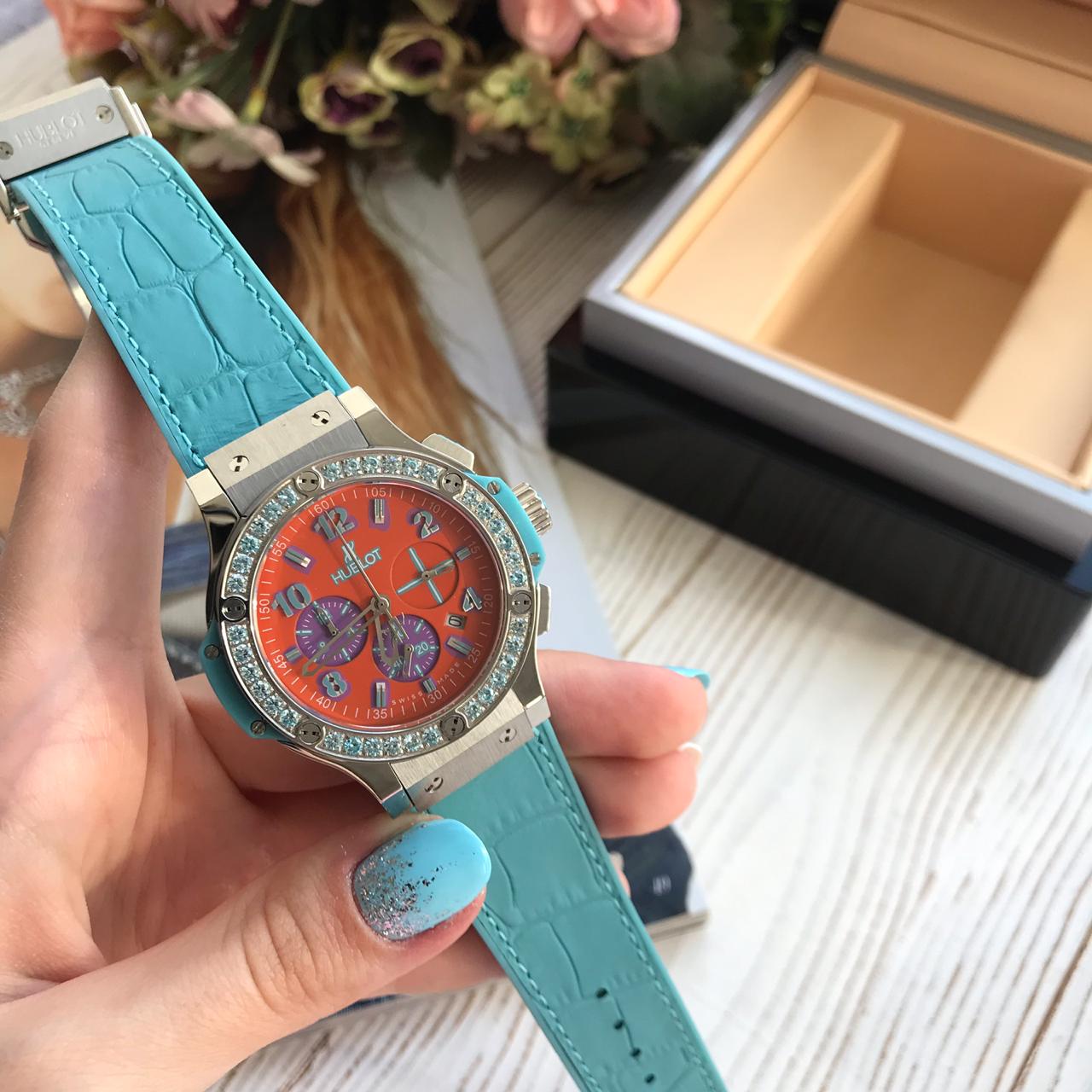 Эти стильные женские часы Hublot LUX-17072 сочетают в себе элегантность и современный дизайн. Оранжевый циферблат с фиолетовыми акцентами и инкрустацией камнями по ободку придает им роскошный вид, а бирюзовый ремешок из текстурированной кожи добавляет яркий и модный акцент.