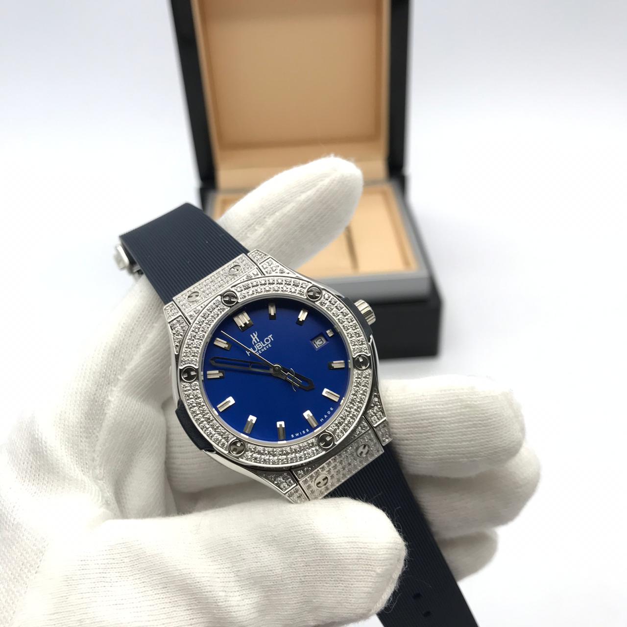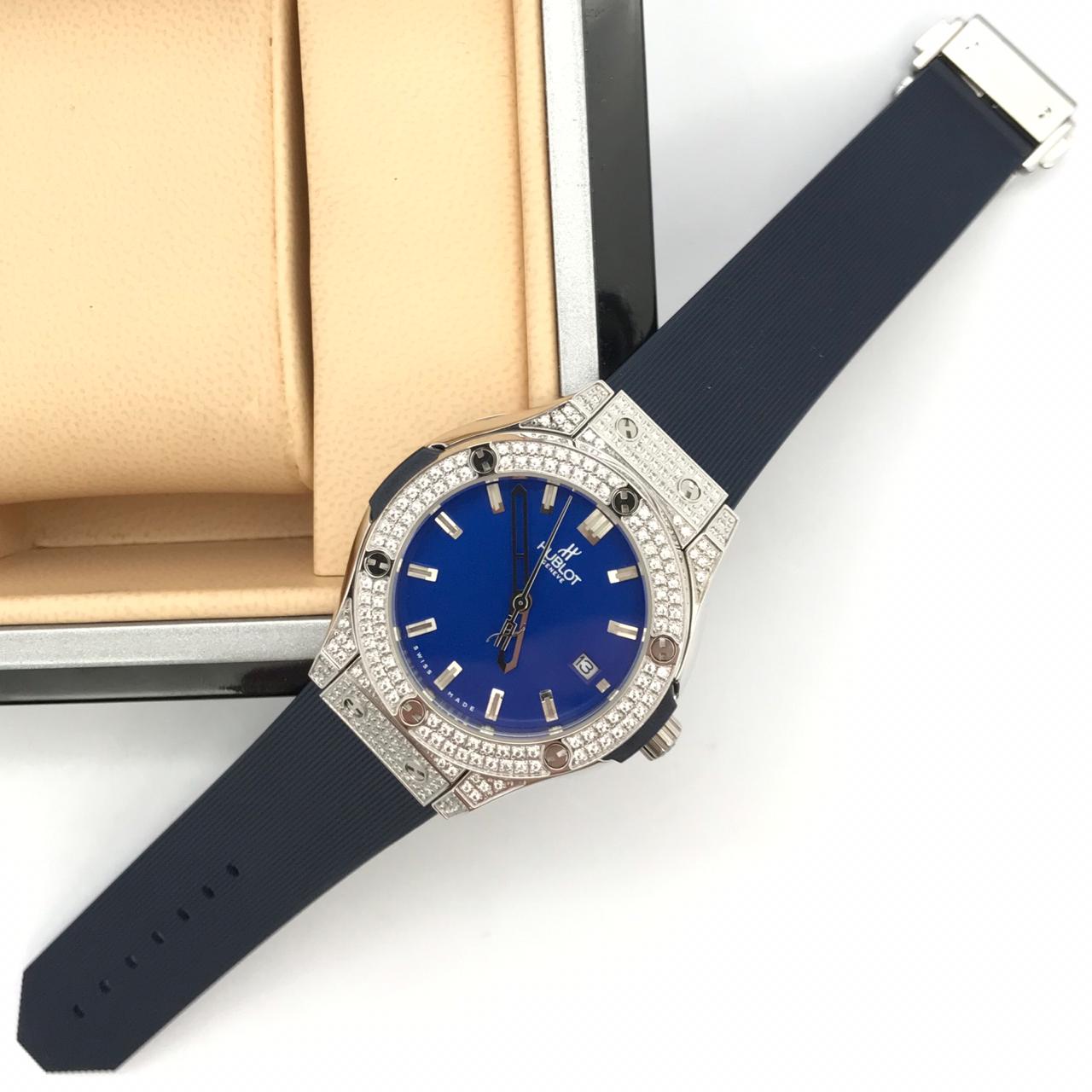 Женские часы Hublot LUX-25219 – это элегантное и роскошное дополнение к образу, выполненное в современном стиле. Синий циферблат контрастирует с серебристым корпусом, инкрустированным кристаллами, придавая часам изысканный вид. Регулируемый каучуковый ремешок обеспечивает комфортное ношение.