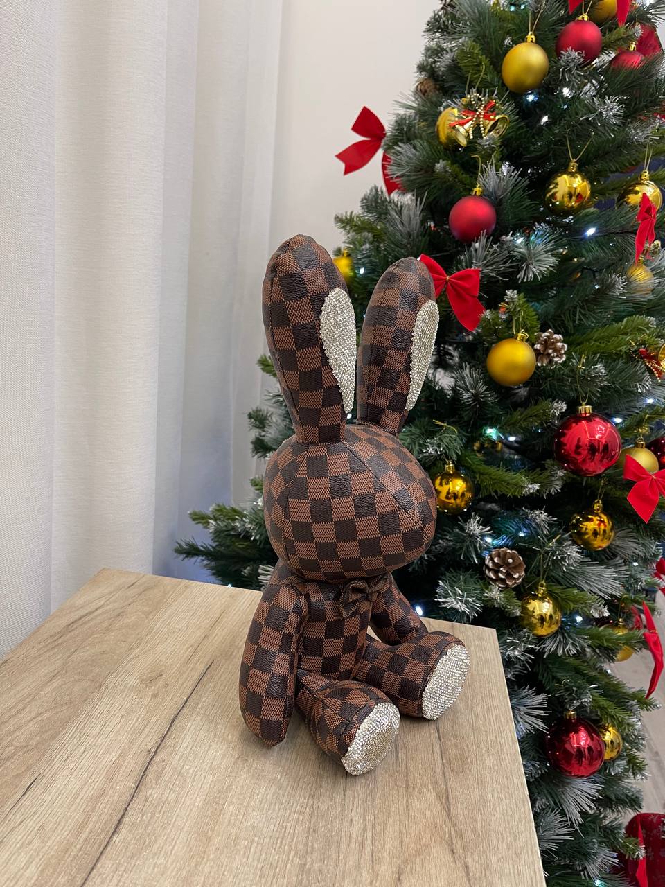Игрушка LUX-100260 представляет собой декоративную игрушку в виде зайца. Игрушка выполнена в клетчатом дизайне, имеет коричневый цвет с темными квадратами. На ушках и лапках присутствуют блестящие элементы.