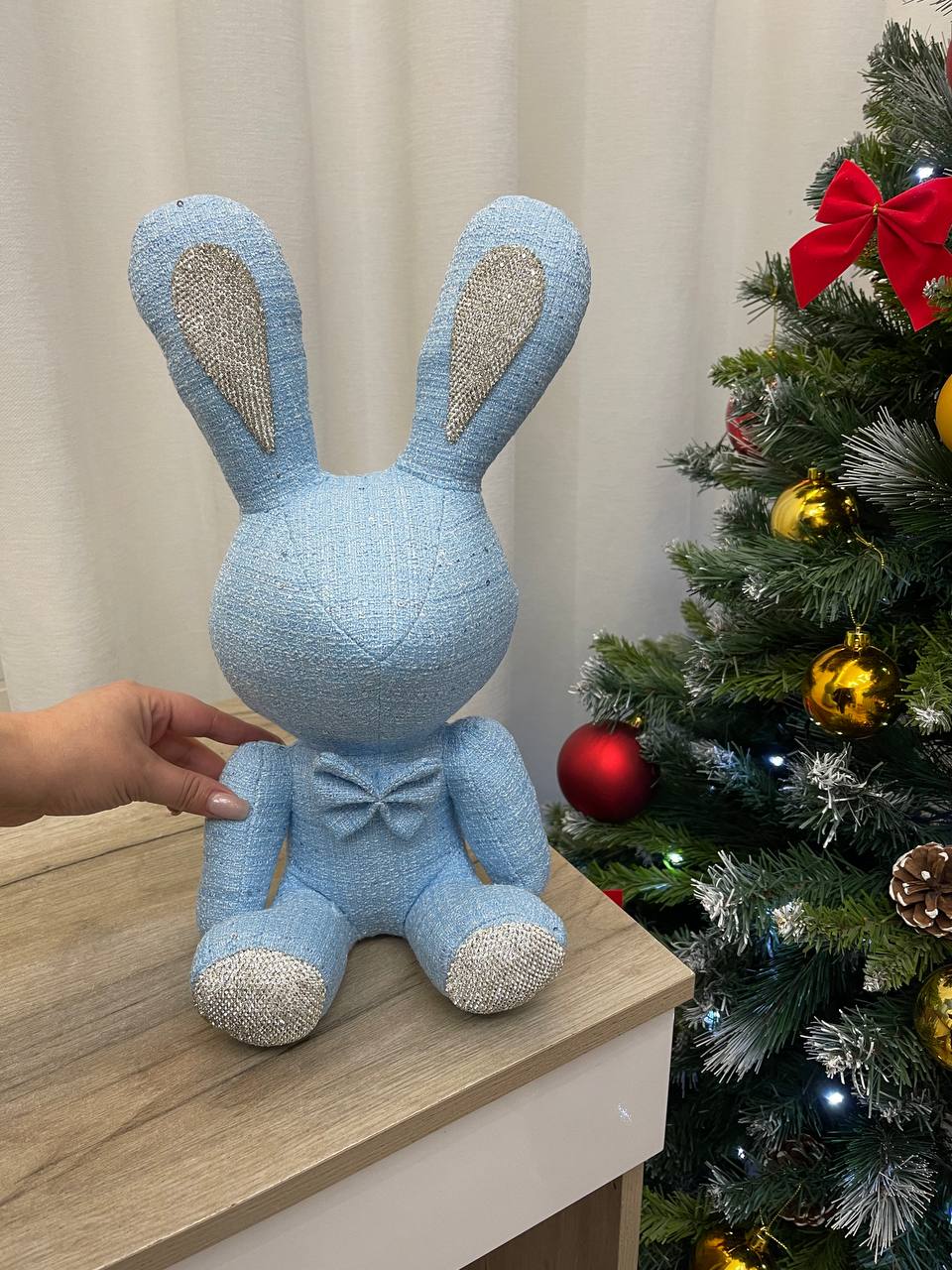 Игрушка LUX-100263 — это декоративная игрушка в форме зайца, выполненная в приятном голубом цвете. Заяц украшен серебристыми элементами, что придает ему праздничный вид и делает его отличным украшением интерьера. Его мягкий текстиль создает ощущение уюта и тепла.