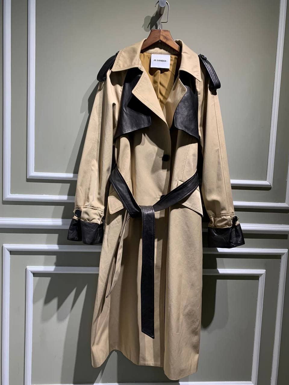 Этот плащ Jil Sander LUX-63567 представляет собой стильное сочетание классического тренча и современных деталей. Бежевый цвет основного материала дополнен контрастными черными вставками из кожи на воротнике, погонах и манжетах, придавая изделию элегантный и выразительный вид. Приталенный силуэт подчеркивается широким поясом, который завязывается на бант, создавая женственный образ. Этот плащ идеально подойдет для создания как повседневных, так и более официальных образов.