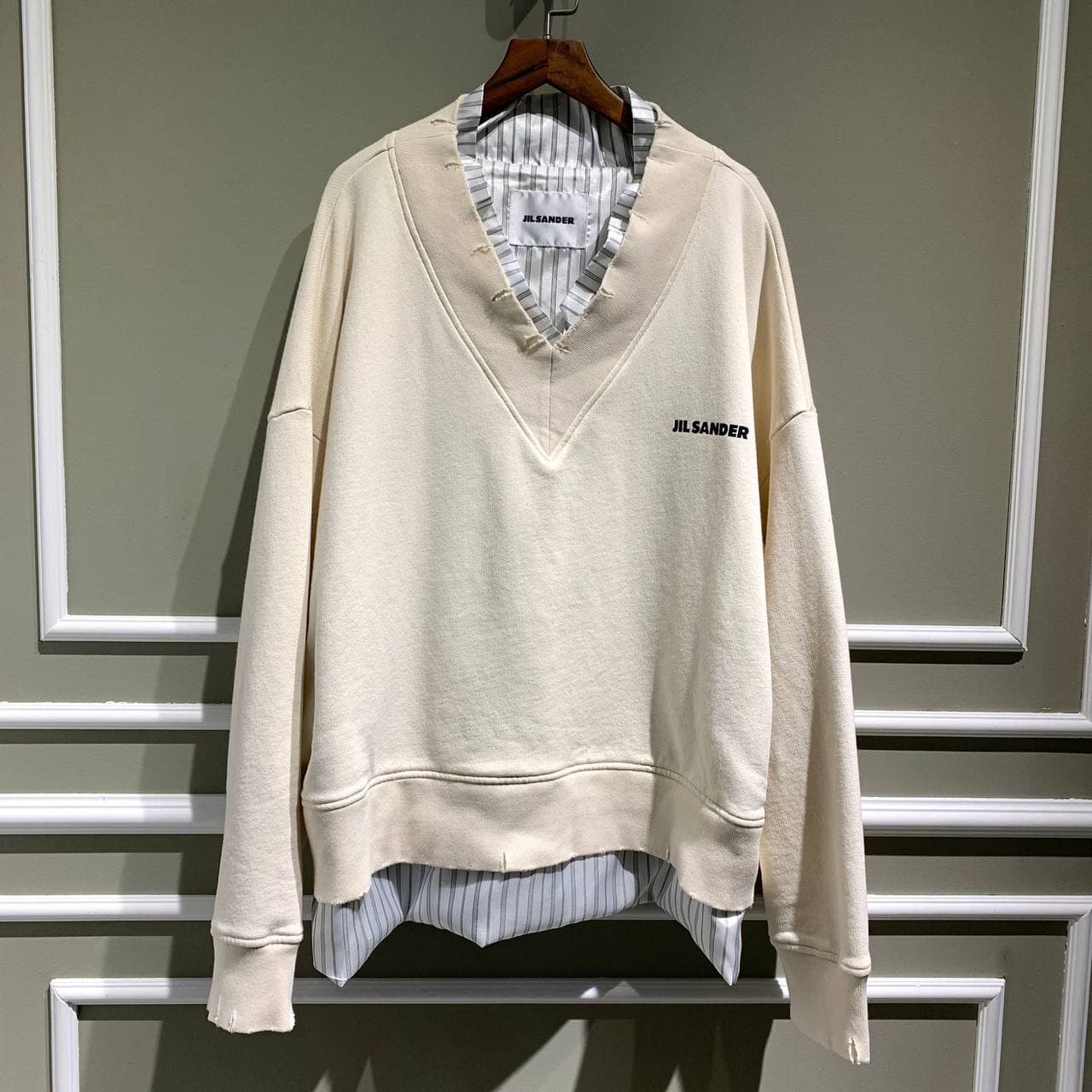 Стильная толстовка Jil Sander LUX-57903 в кремовом оттенке представляет собой оригинальное сочетание спортивного и элегантного стилей. Эта модель с V-образным вырезом, украшенным необработанным краем, создает уникальный образ. Под слоем толстовки видна рубашка в тонкую полоску, что добавляет изделию многослойности и изысканности. Логотип бренда, расположенный на груди, подчеркивает принадлежность к высокому модельному ряду.