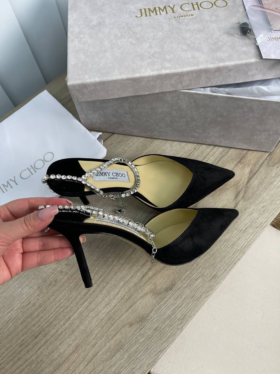 Босоножки Jimmy Choo LUX-52769 — это изысканная обувь для женщин, которая подчеркнет ваш элегантный образ. Черный замшевый верх и утонченный каблук делают их идеальным выбором для вечерних выходов и особых случаев. Декоративная цепочка с кристаллами добавляет модели блеска и утонченности, привлекая восхищенные взгляды.