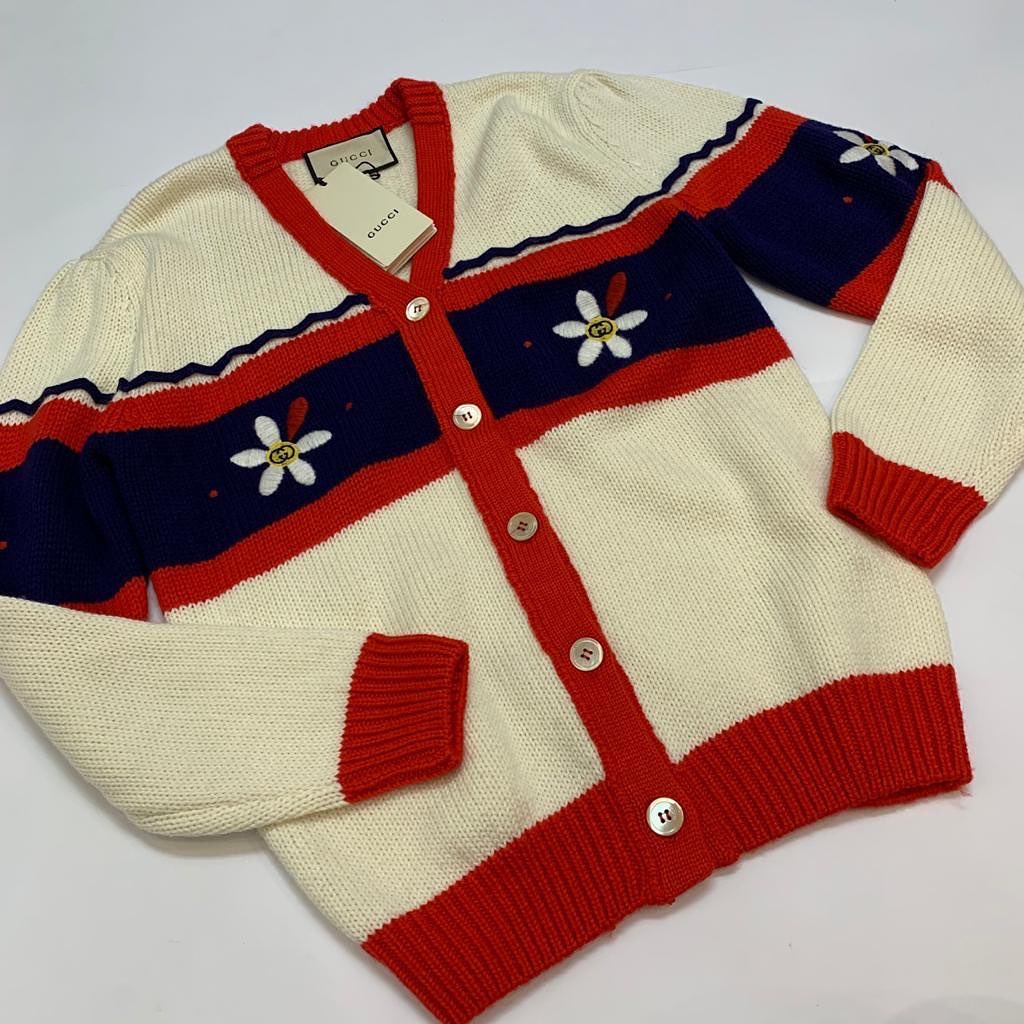 Этот женский кардиган LUX-36333 от Gucci — воплощение игривого и стильного дизайна, идеально подходящего для создания ярких и запоминающихся образов. Акцент сделан на деталях: контрастные полосы темно-синего и красного цветов, украшенные вышивкой в виде белых цветов с желтой серединкой, придают изделию особый шарм. Кремовая основа кардигана, пуговицы в тон и эластичная резинка по низу и на манжетах обеспечивают комфортную посадку.