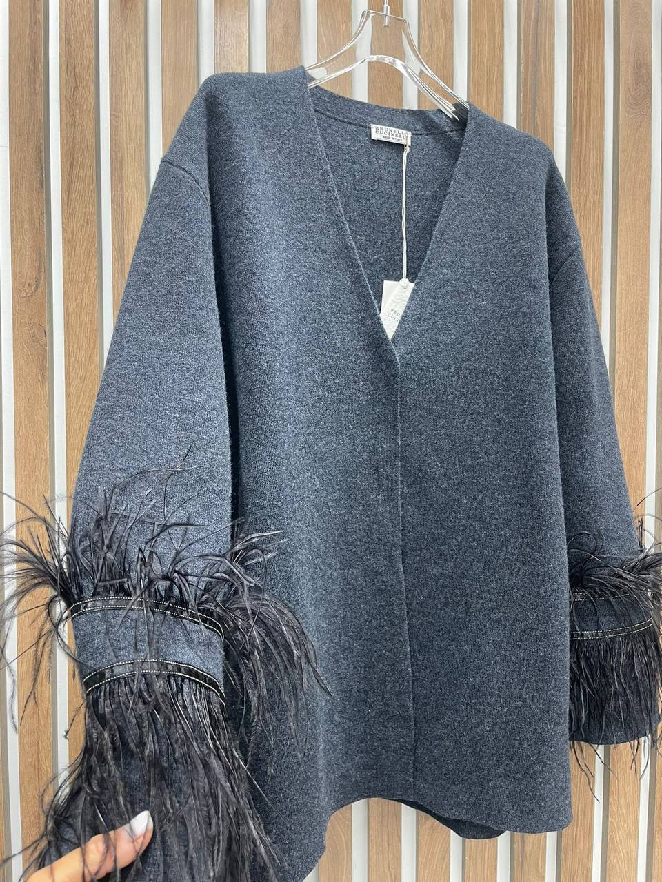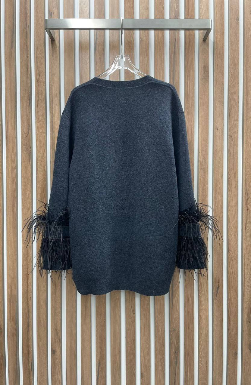 Кардиган LUX-100400 – стильный элемент гардероба. Кардиган выполнен в приглушенном сером цвете, обладает мягкой текстурой и длинными рукавами, украшенными объемными черными перьями на манжетах. Такой кардиган станет отличным дополнением к повседневному или вечернему образу.