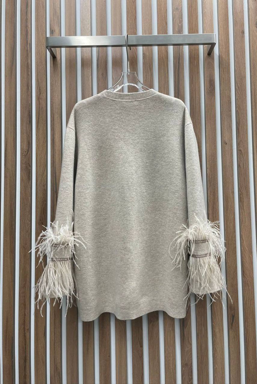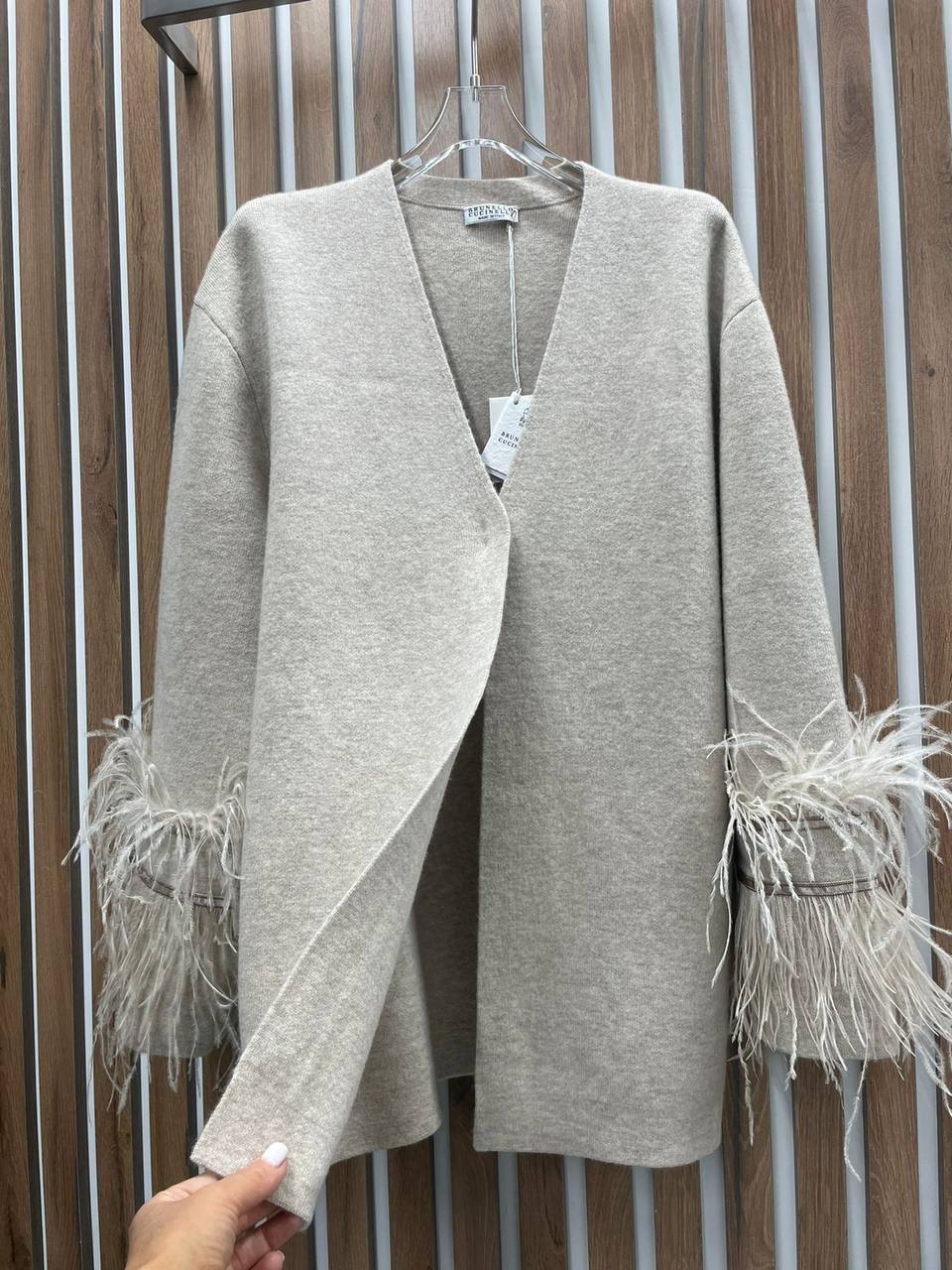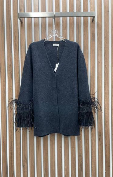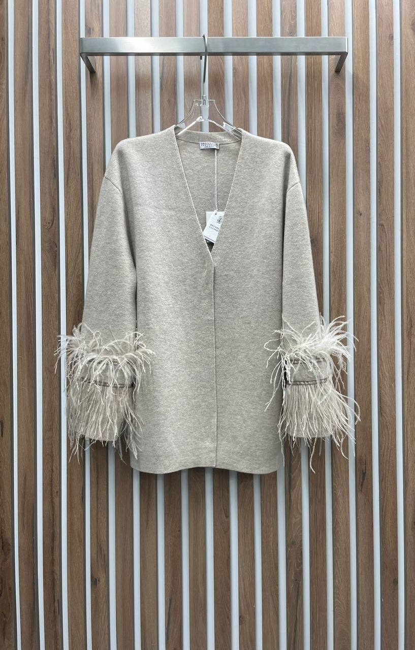 Кардиган LUX-100401 представляет собой стильное изделие, сочетающее в себе элегантность и комфорт. Кардиган выполнен в бежевом цвете, с длинными рукавами, украшенными перьями на манжетах, что придает ему изысканный вид. Он идеально подойдет для создания как повседневных, так и более нарядных образов.
