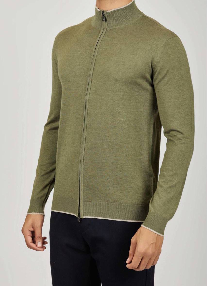 Кардиган Eleven LUX-110048 — это стильный предмет гардероба для мужчин. Кардиган выполнен в оливковом цвете и имеет классический крой с воротником-стойкой и застежкой на молнии. Он идеально подходит для создания повседневных образов.