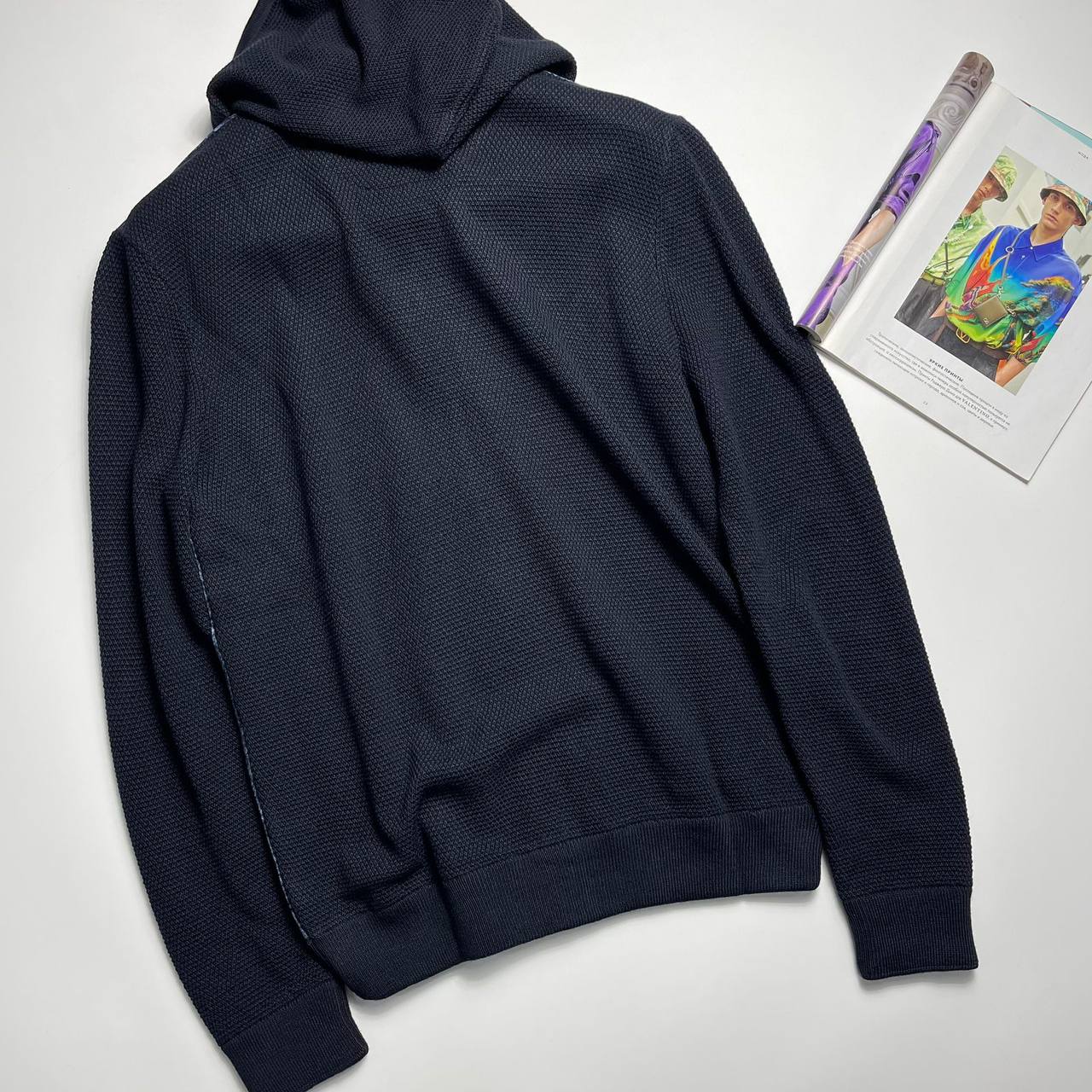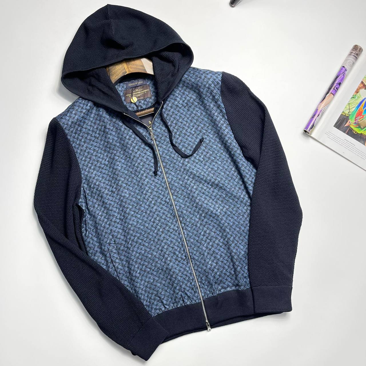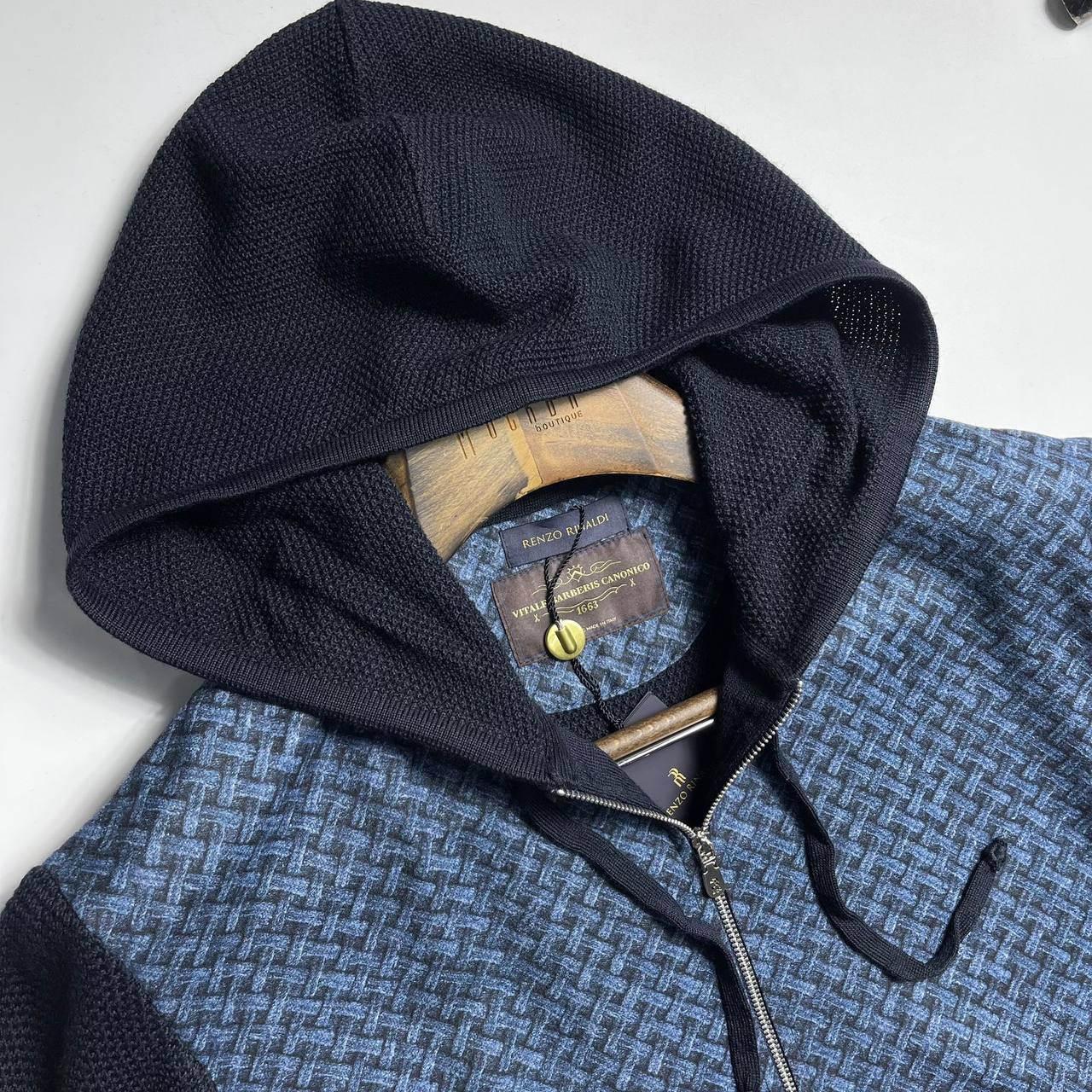 Кардиган Renzo Rinaldi LUX-110058 – стильный кардиган с капюшоном, выполненный в синем цвете с узором на основной части и контрастными рукавами. Он имеет современный дизайн и будет отличным выбором для создания повседневных образов. Идеально подходит для прохладной погоды.