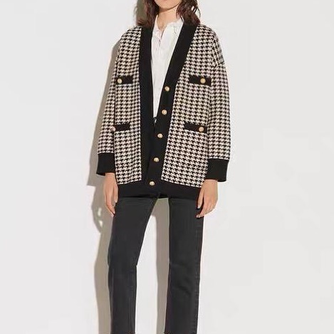 Кардиган Sandro LUX-35886 – это элегантный женский кардиган, выполненный в классическом стиле и узоре "гусиная лапка". Он идеально подходит для создания изысканных и стильных образов, как для повседневной носки, так и для особых случаев. Сочетание черного и бежевого цветов с золотистыми пуговицами придает изделию роскошный вид.