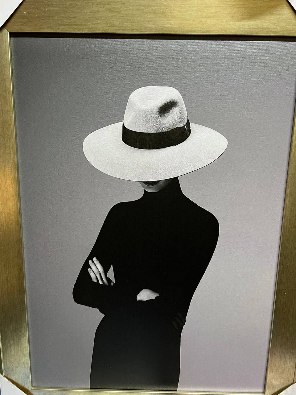 Картина LUX-100467 - это элегантное произведение искусства в стиле минимализм, изображающее женщину в шляпе. Черно-белый дизайн, контрастирующий фон и золотая рамка придают картине изысканный вид. Она отлично подойдет для украшения современного интерьера.
