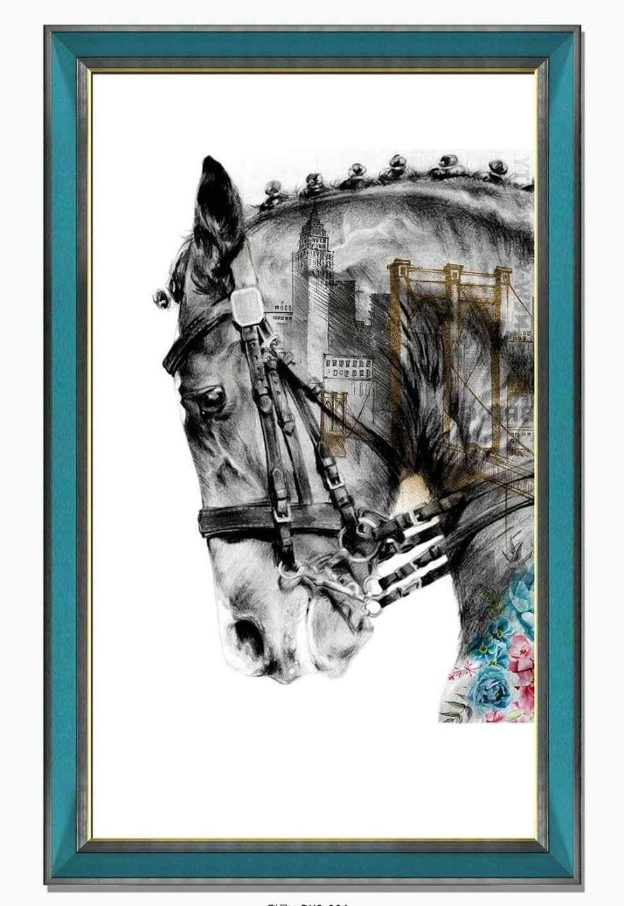 Эта картина от LUXE, выполненная в стиле современной графики, сочетает в себе реалистичное изображение головы лошади с элементами городского пейзажа и ярким цветочным орнаментом. Черно-белая графика лошади контрастирует с детализированными силуэтами зданий и моста, создавая глубину композиции. Неожиданное включение акварельных цветов вносит динамичность и изысканность, делая произведение уникальным.