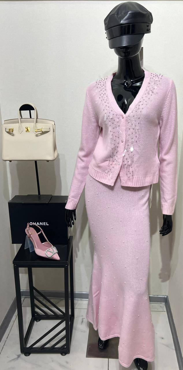 Кашемировый костюм LUX-111577 – это изысканный комплект, состоящий из кофты и юбки, выполненный в нежно-розовом цвете. Костюм отличается элегантным дизайном, украшен декоративными элементами, что добавляет образу женственности и шарма. Он идеально подойдет для создания утонченного и стильного образа.