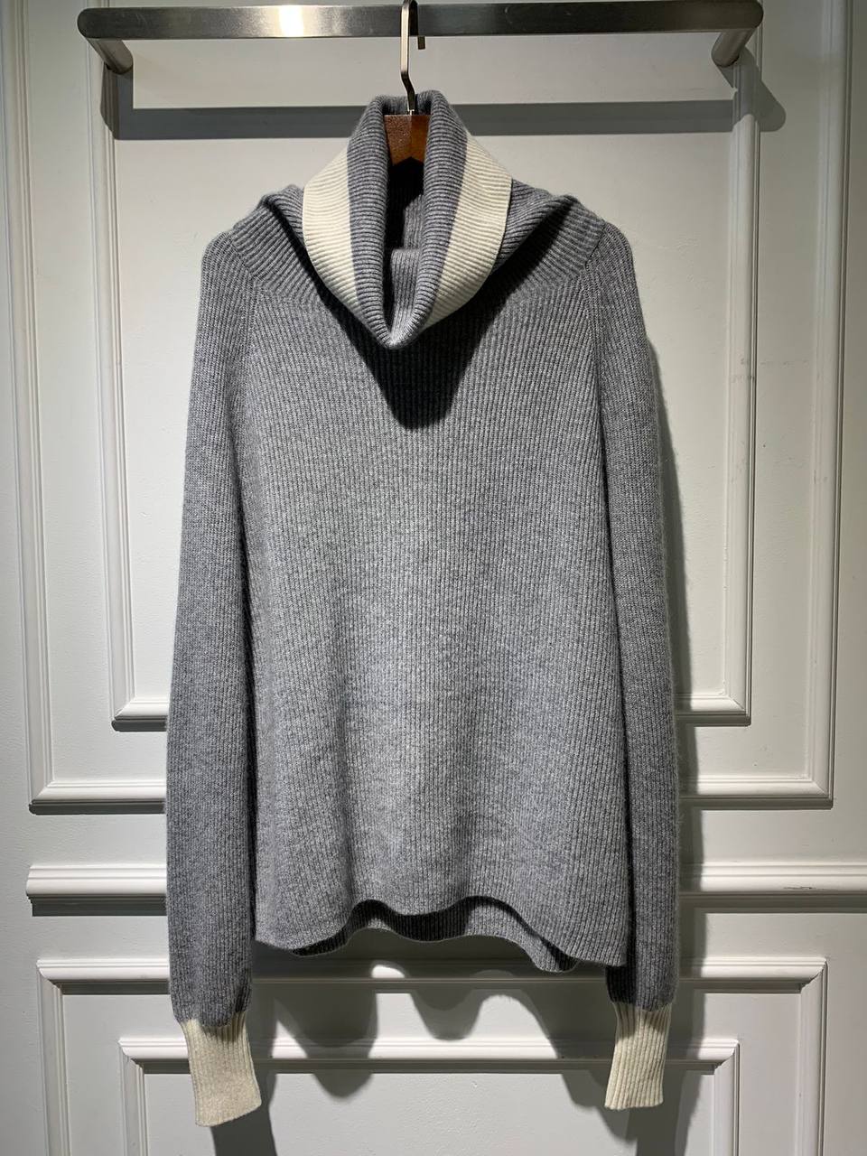 Кашемировый свитер LUX-79758 — это стильный свитер с высоким воротником, выполненный в сером цвете с контрастными белыми манжетами и воротником. Его текстура — рубчик, обеспечивающая элегантный вид. Этот свитер идеально подходит для повседневной носки, добавляя тепло и стиль в ваш образ.