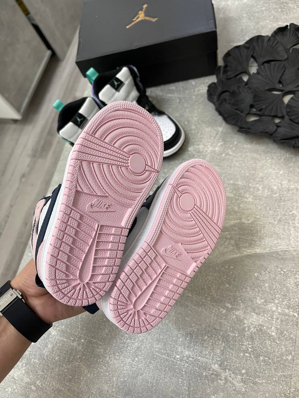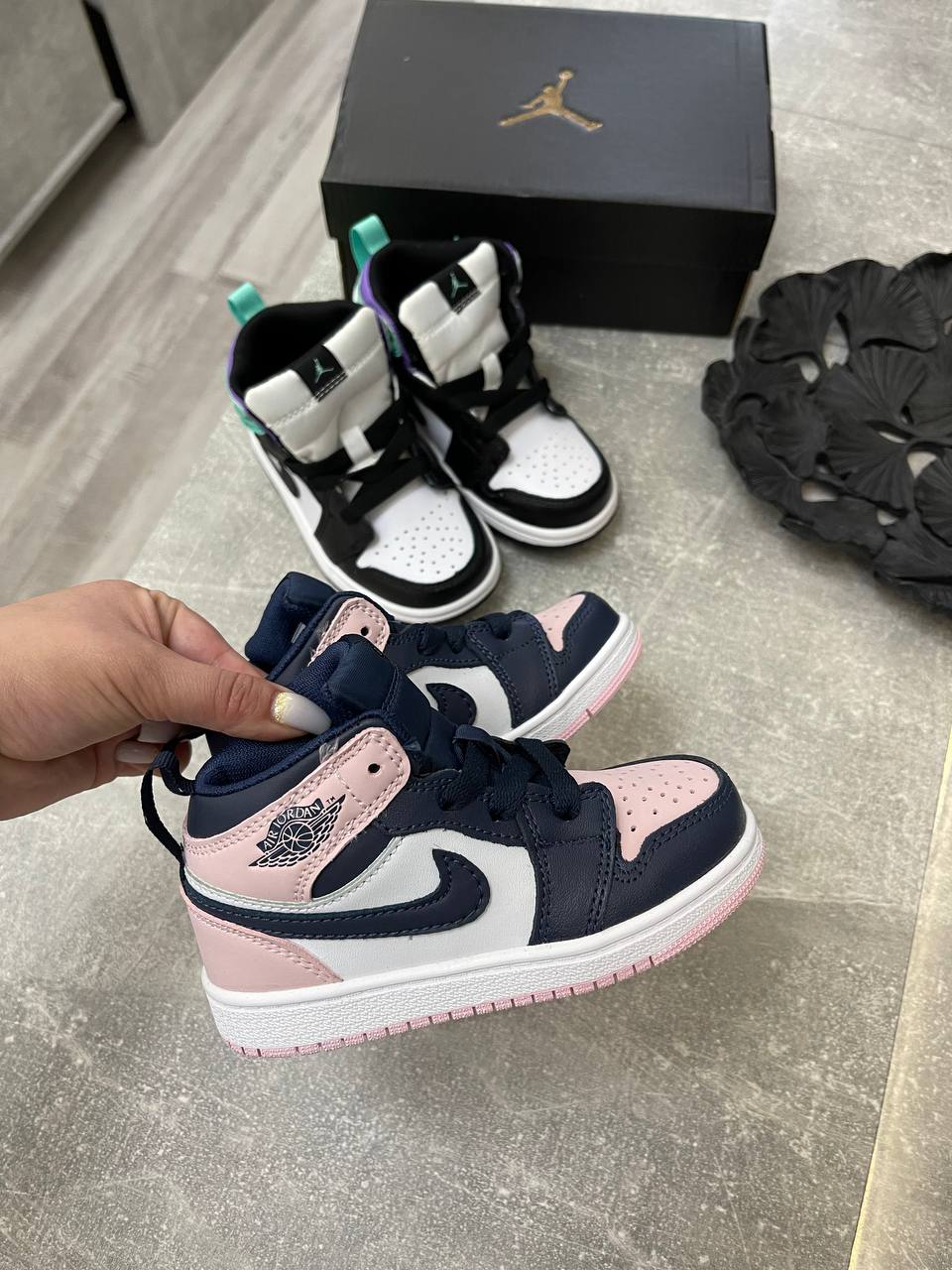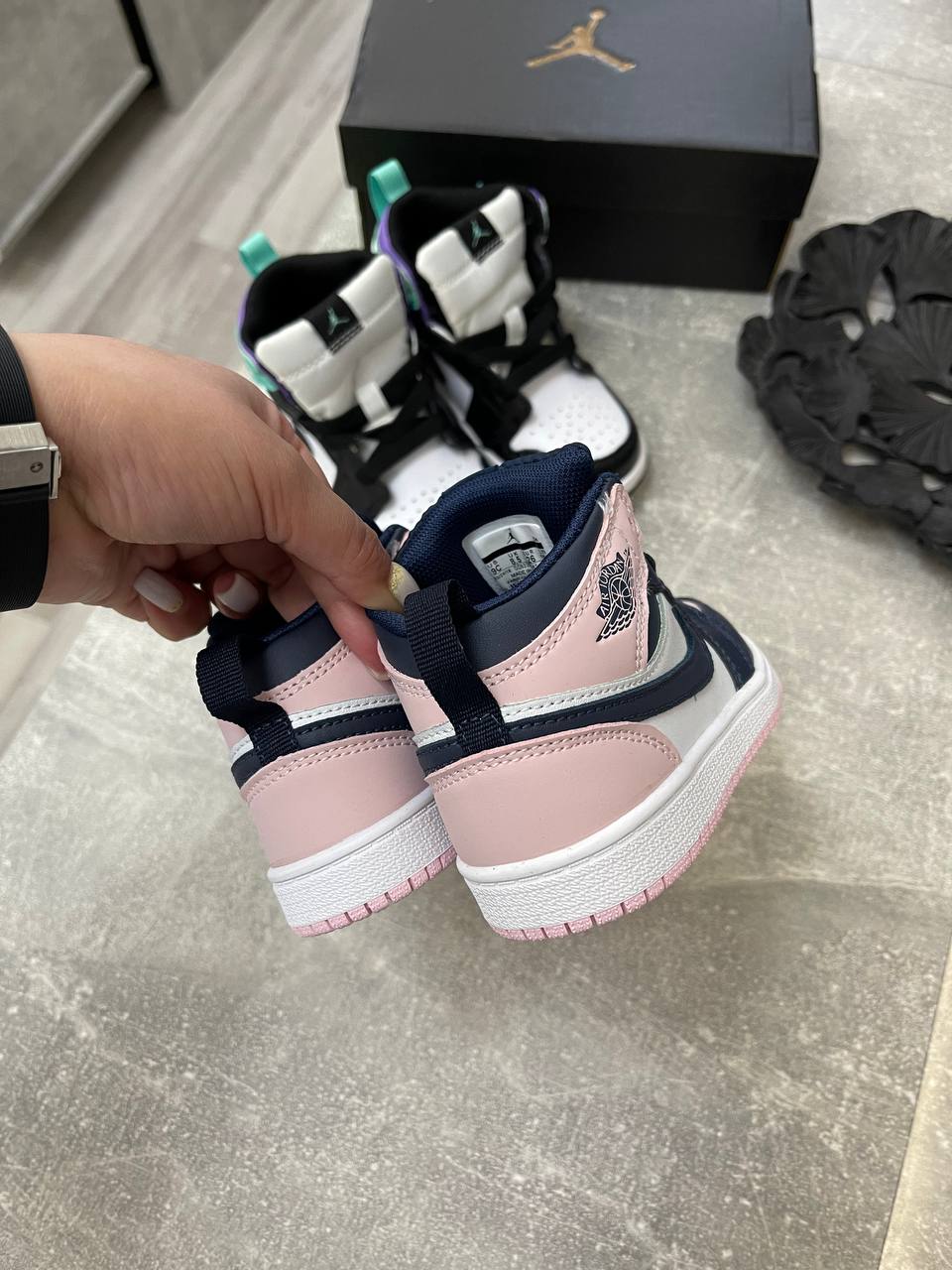 Кеды Nike Air Jordan 1 Mid (синий/розовый) — это стильная детская обувь, которая сочетает в себе классический дизайн и современные элементы. Основные цвета кед — темно-синий и розовый с белыми элементами. Они отлично подойдут для повседневной носки, прогулок и активного отдыха.