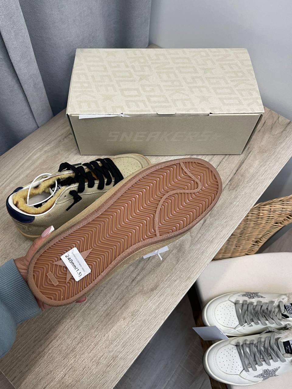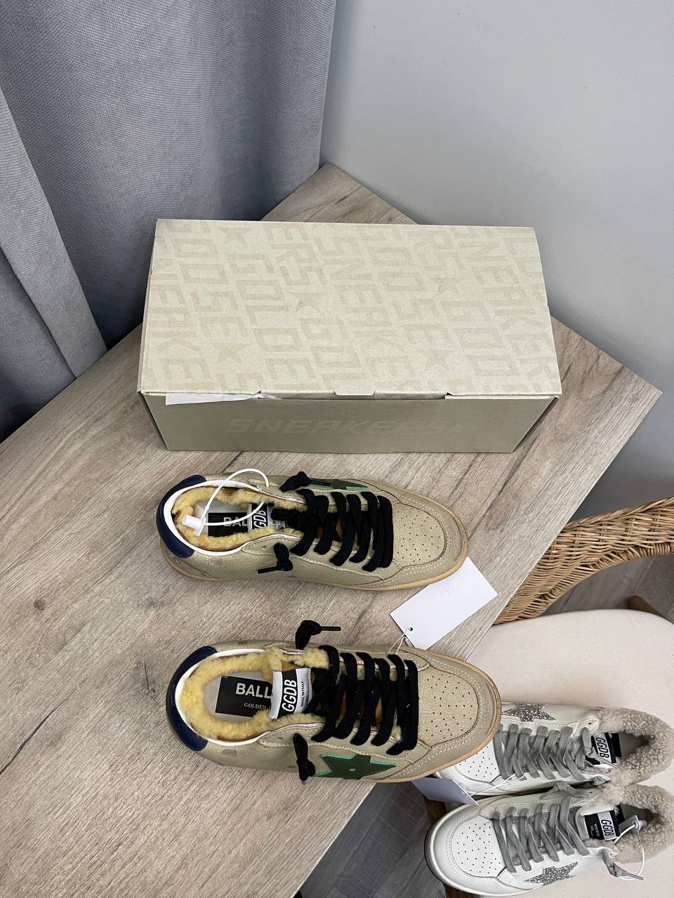 Кеды женские Golden Goose LUX-111737 - это стильная обувь для повседневной носки. Обувь выполнена в бежевом цвете, с оригинальным дизайном: на боковой стороне - зеленая звезда, черные шнурки и внутренняя отделка с мехом. Кеды отличаются высоким качеством материалов и удобством.