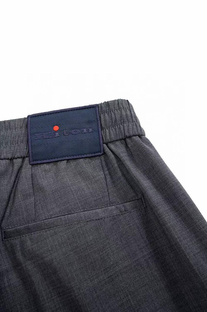 Брюки Kiton LUX-115313 — это элегантные повседневные брюки классического кроя. Представлены в темно-сером цвете. Текстура ткани видна на изображении, что намекает на высокое качество материала и комфорт в носке.