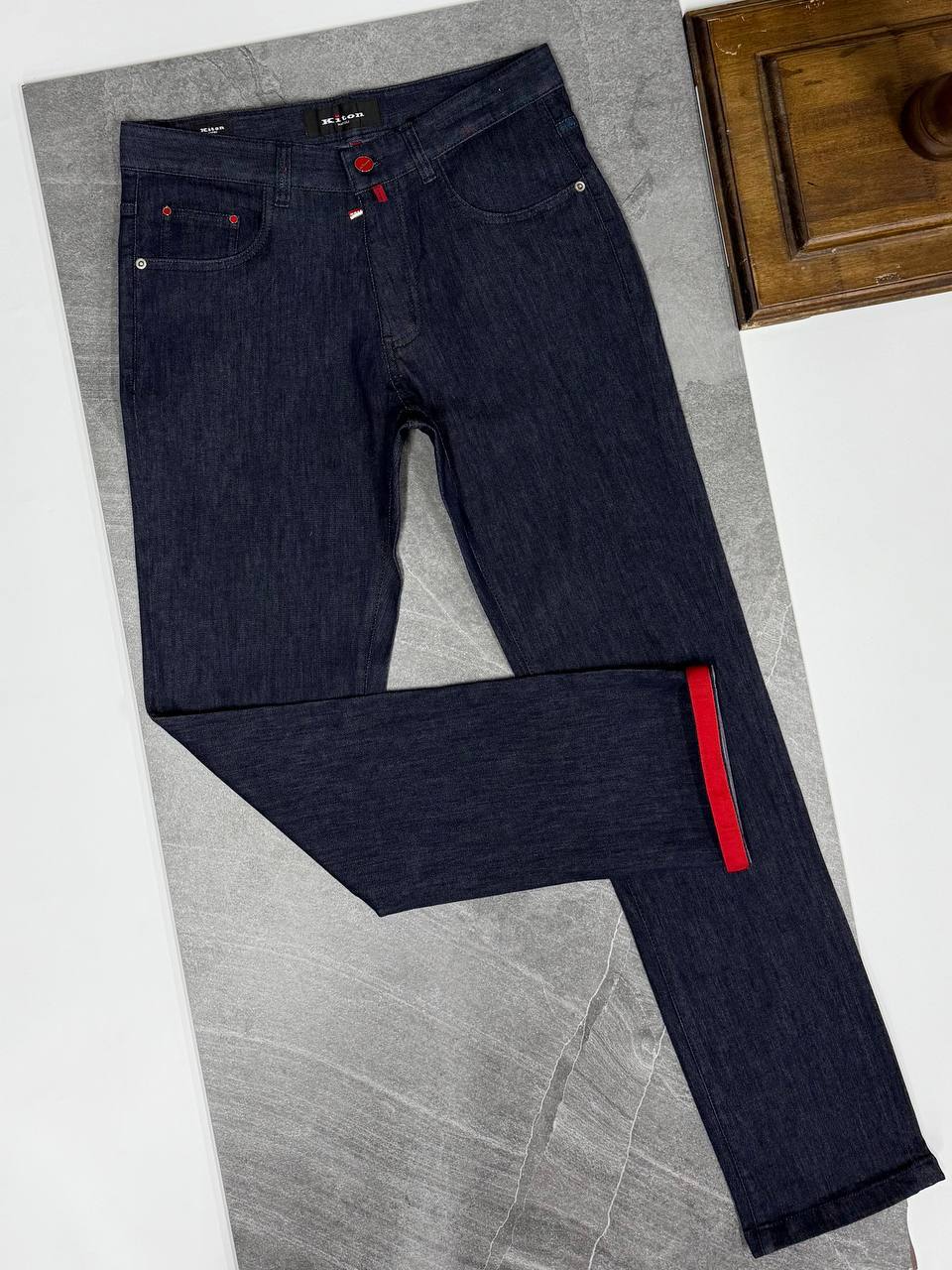 Джинсы Kiton LUX-119176 — это воплощение элегантности и стиля. Темно-синие джинсы с прямым кроем станут отличным выбором для создания повседневных и вечерних образов. Яркой деталью являются отвороты с красной подкладкой.