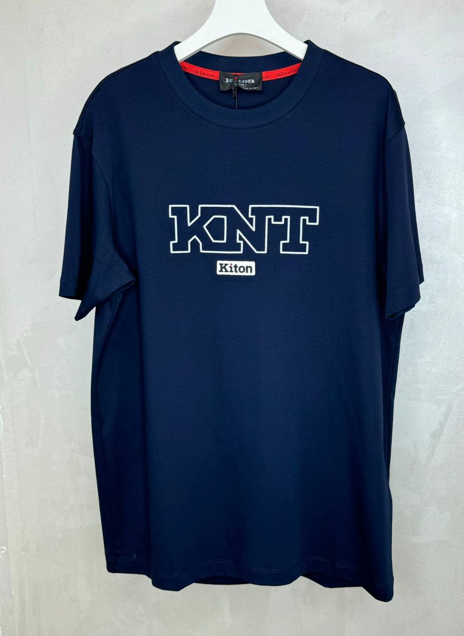 На фотографии представлена стильная мужская футболка Kiton LUX-120480. Это удобная и элегантная вещь, которая легко впишется в повседневный гардероб. Футболка выполнена в темно-синем цвете с крупным белым принтом.